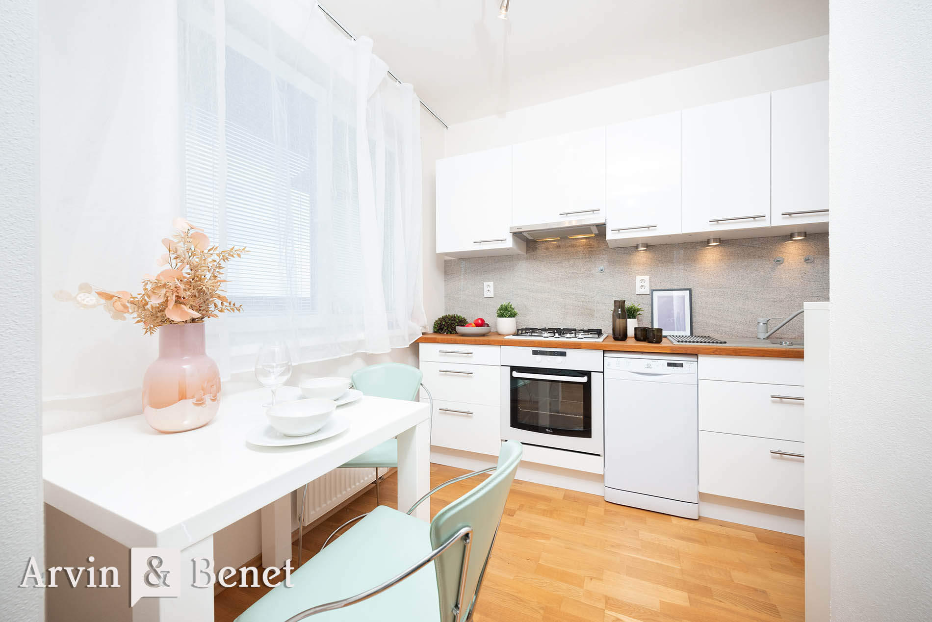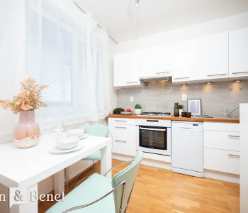 Vpravo od obývačky sa nachádza moderná kuchyňa v nadčasovej bielej farbe. Kuchyňa je vybavená všetkými štandardnými spotrebičmi vrátane umývačky riadu a nechýba tu ani jedálenský stôl, pri ktorom sa pohodlne najete aj s tromi ďalšími návštevníkmi.