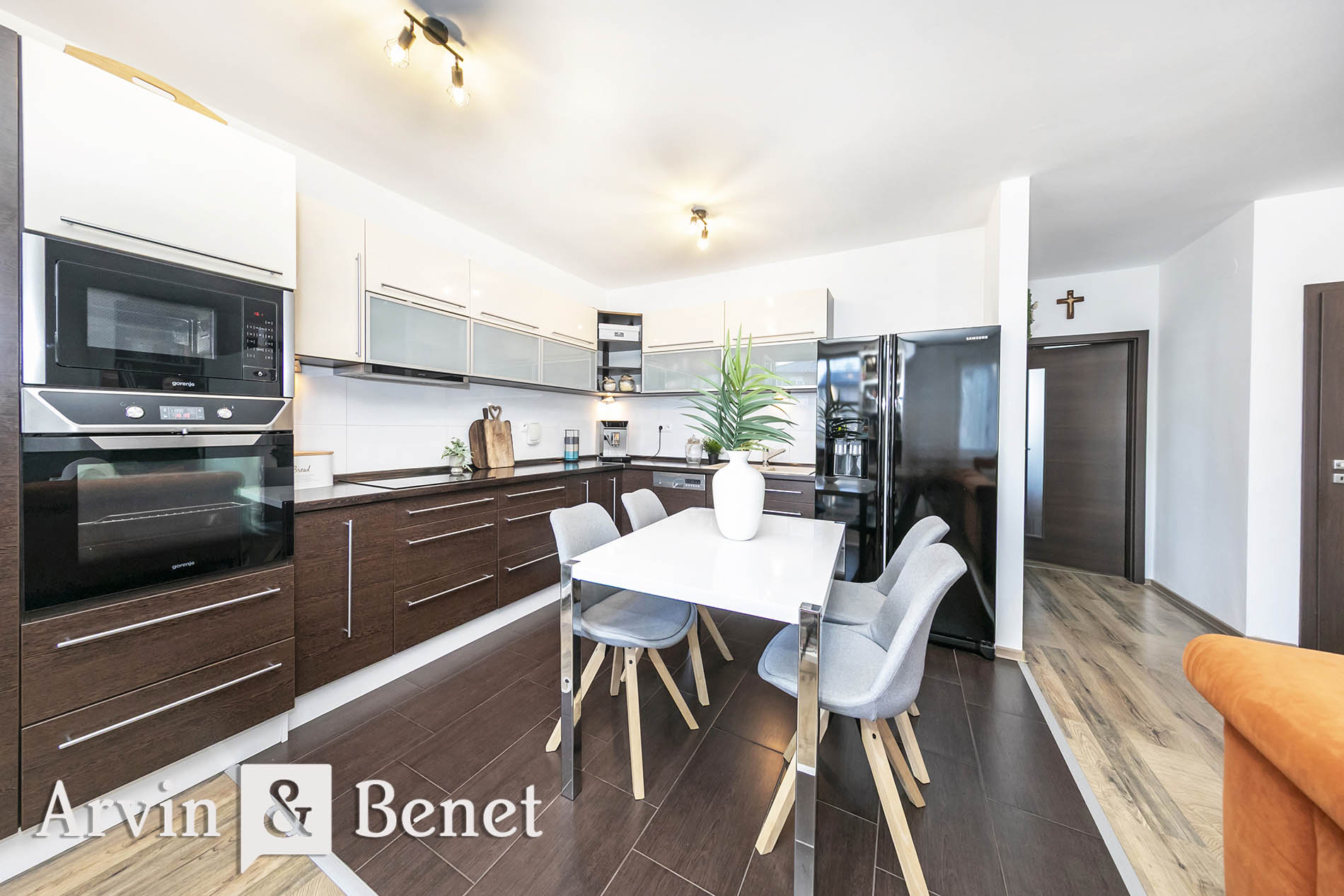 Dominantou bytu je priestranná a svetlá obývacia izba, ktorá je plynulo prepojená s kuchyňou a jedálenskou časťou. Tento otvorený koncept vytvára vzdušný denný priestor ideálny na spoločné chvíle s rodinou aj priateľmi. Moderná kuchyňa je premyslene riešená a kompletne vybavená vstavanými spotrebičmi, čo zabezpečuje maximálny komfort pri každodennom varení aj stolovaní.