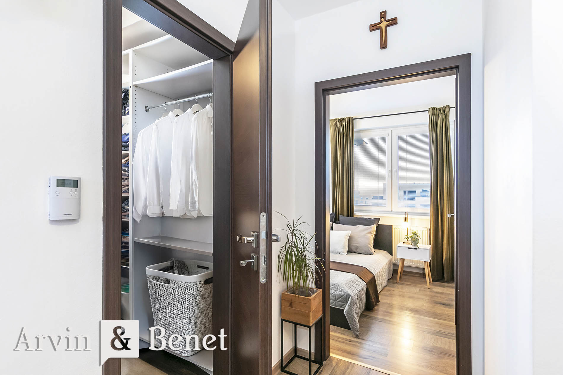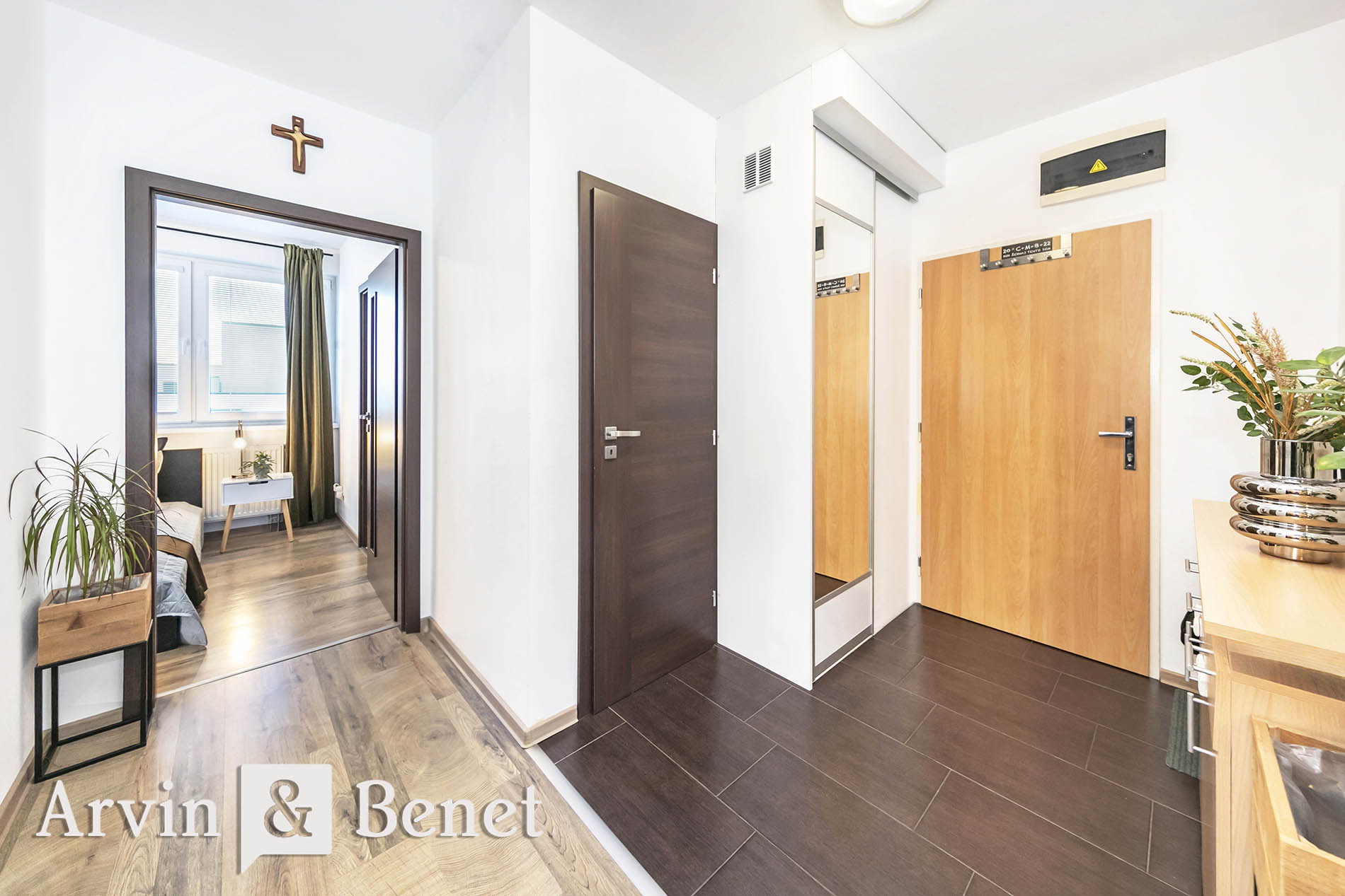 Byt sa nachádza v starostlivo udržiavanom bytovom dome, ktorý už pri vstupe vytvára príjemnú a reprezentatívnu atmosféru. Po otvorení bezpečnostných dverí vás privíta vkusná predsieň so vstavanou šatníkovou skriňou a praktickou chodbovou zostavou, ktorá poskytuje dostatok úložného priestoru.