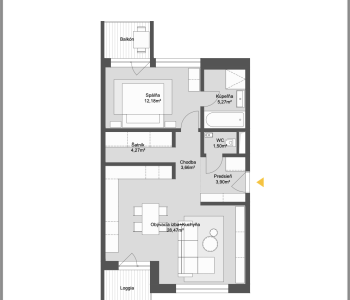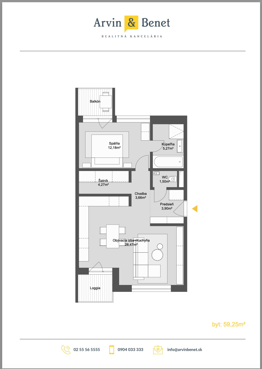 Výmera: 69,19 m2 (59,1 m² interiér + 4,28 m² presklený balkón na juh + 3,83 m² loggia na sever + 1,98 m² murovaná kobka)