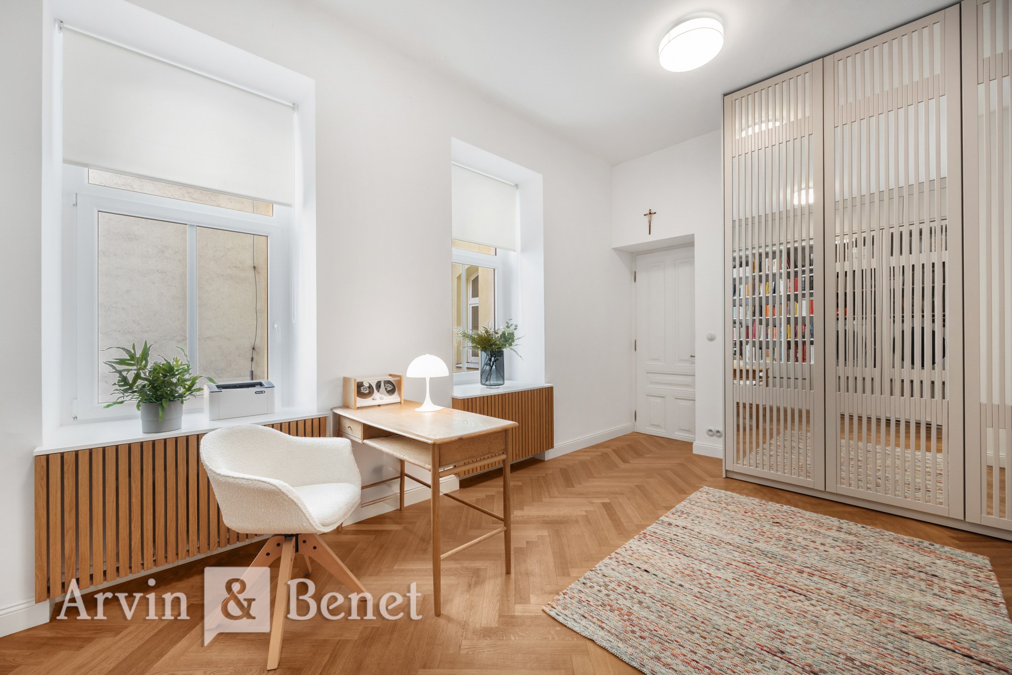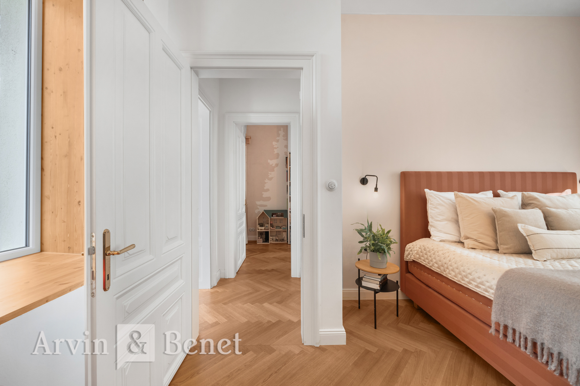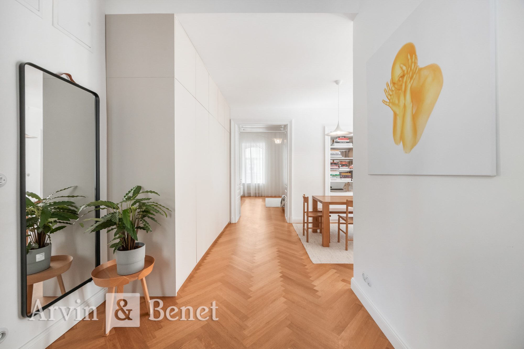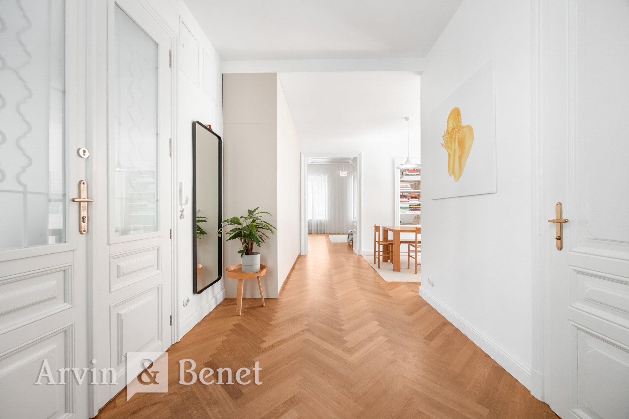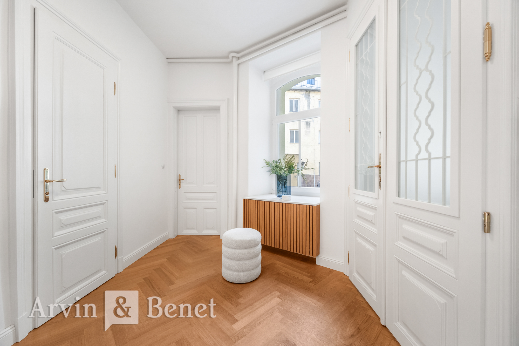 4-izbový byt v historickom dome po kompletnej rekonštrukcii, ktorá citlivo zachovala to, čo sa nedá postaviť znova – vysoké stropy so štukou a rozetami, originálne dvojkrídlové dvere s mosadzným kovaním a mliečnym sklom, dubové parkety v rybom vzore v celom byte.
