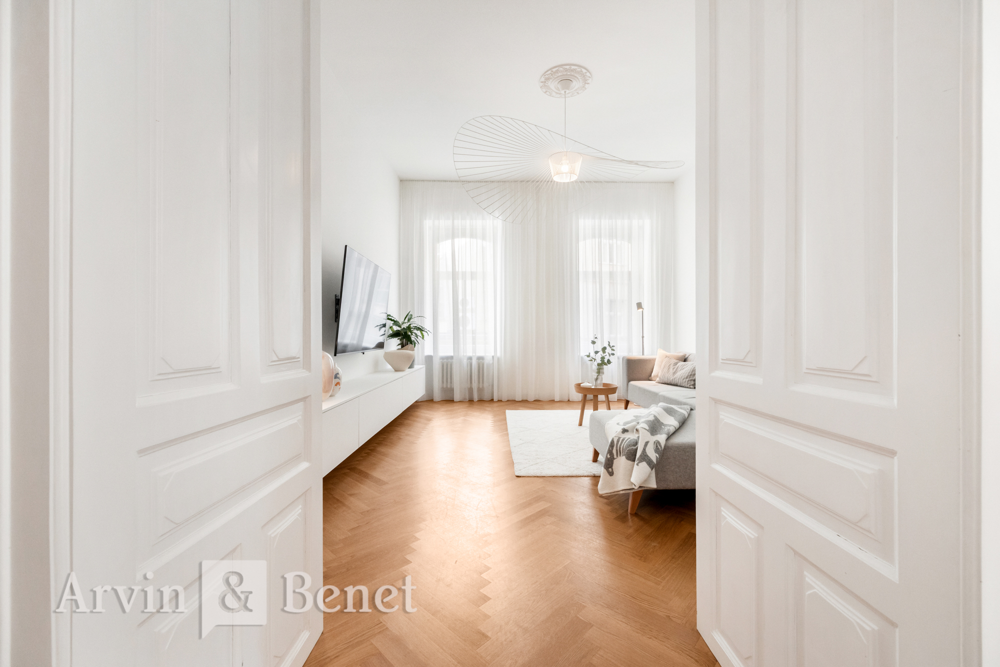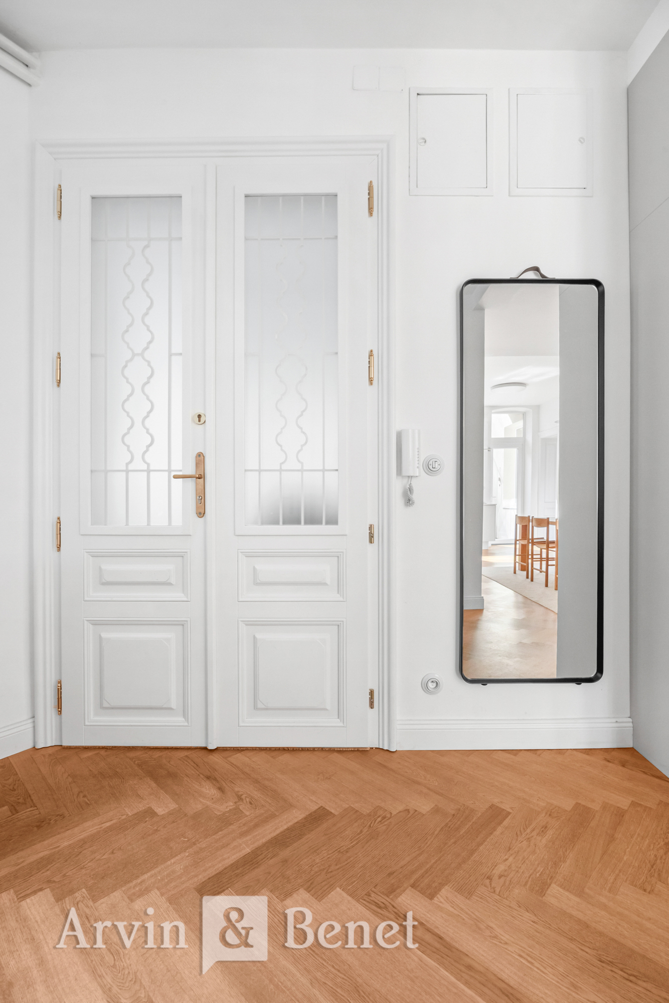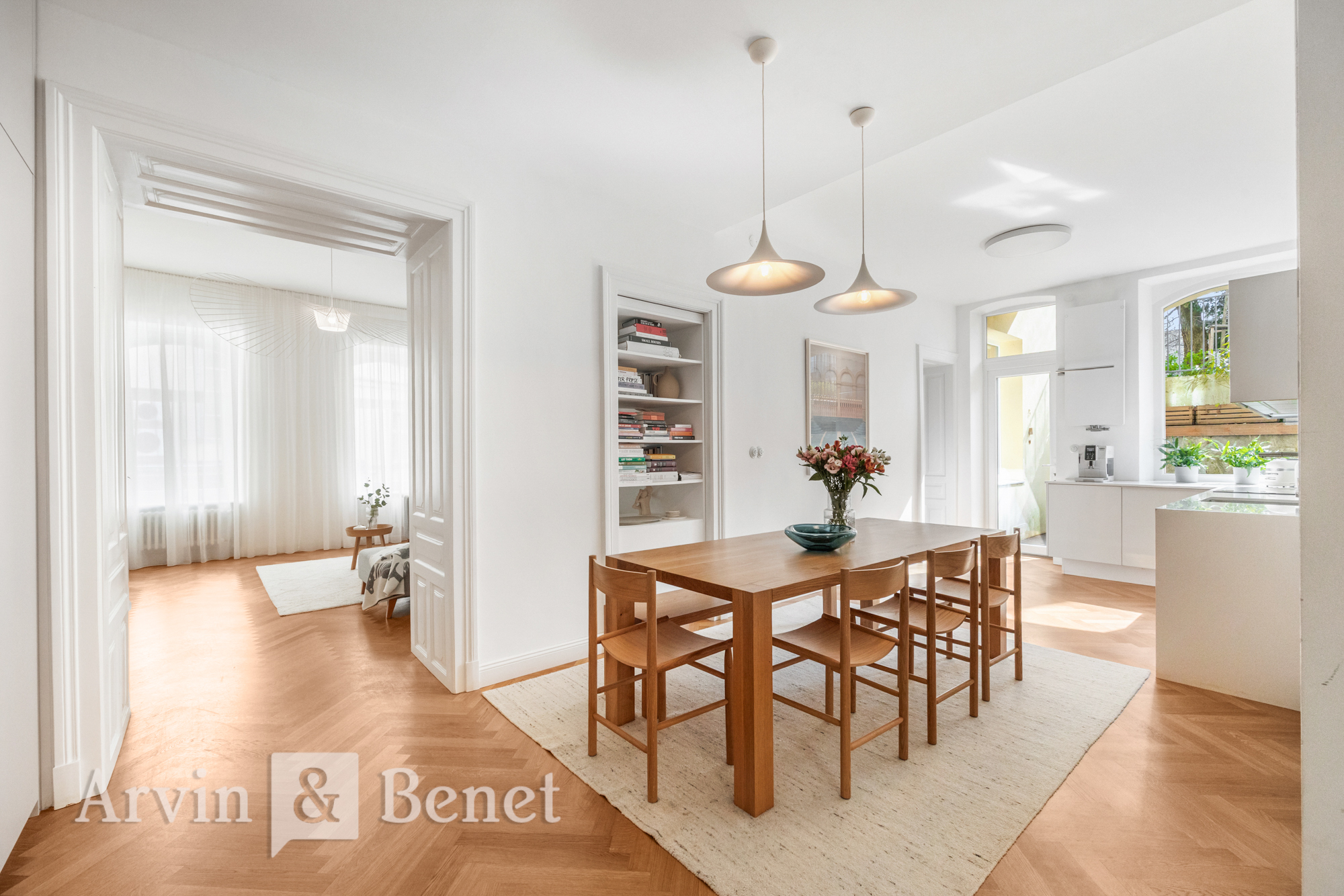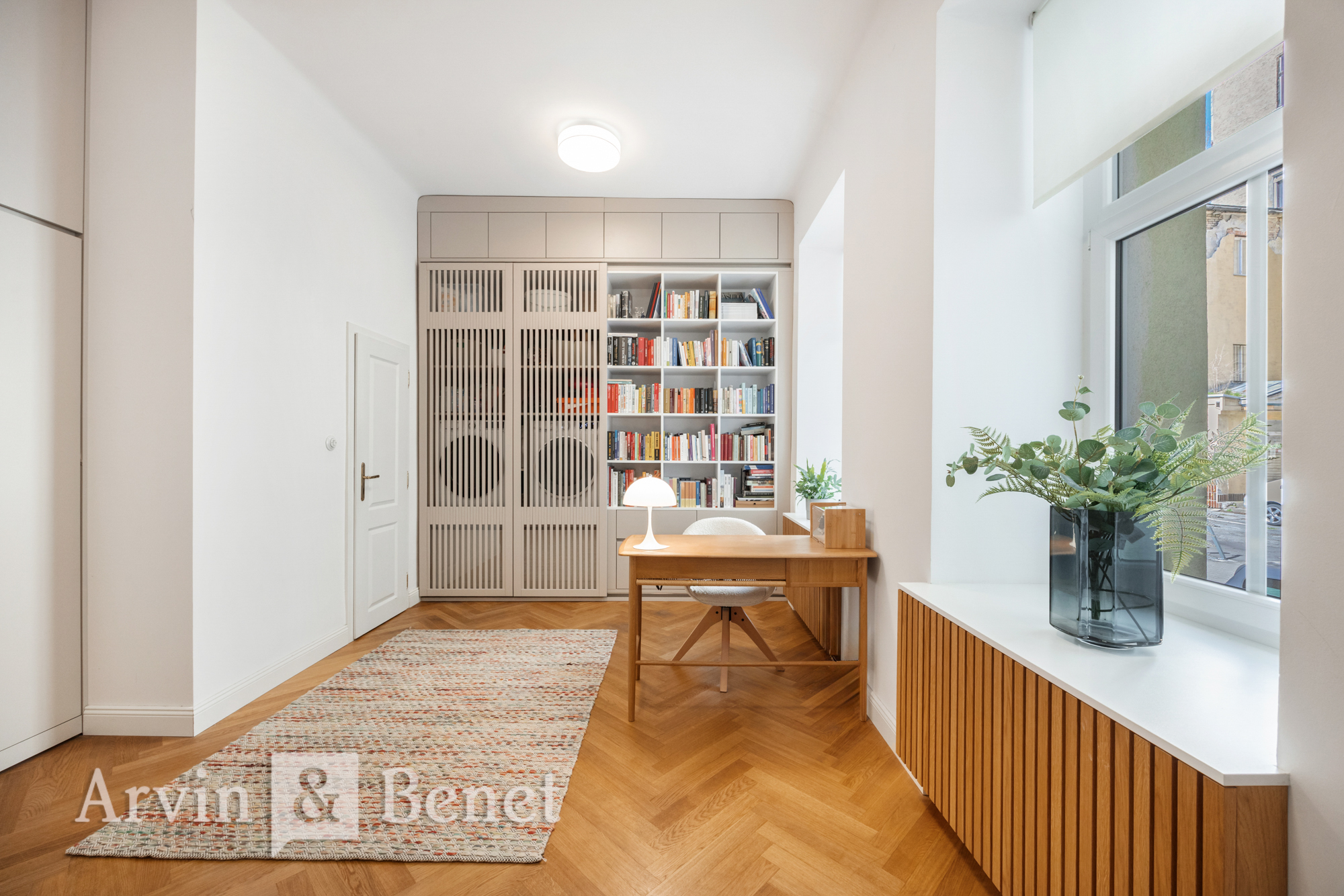 4-izbový byt v historickom dome po kompletnej rekonštrukcii, ktorá citlivo zachovala to, čo sa nedá postaviť znova – vysoké stropy so štukou a rozetami, originálne dvojkrídlové dvere s mosadzným kovaním a mliečnym sklom, dubové parkety v rybom vzore v celom byte.