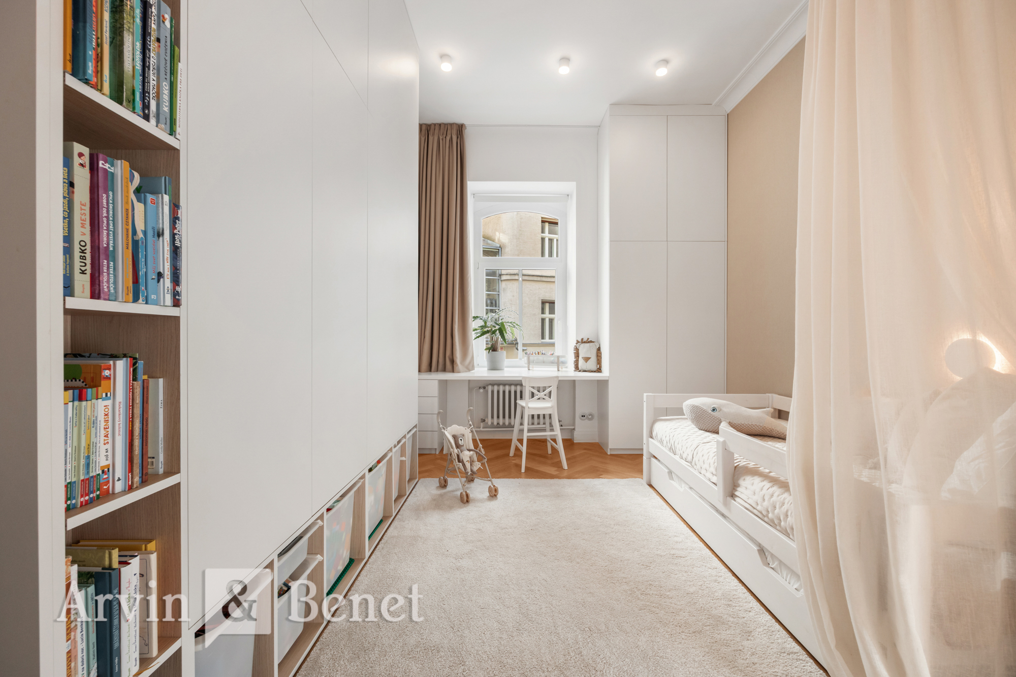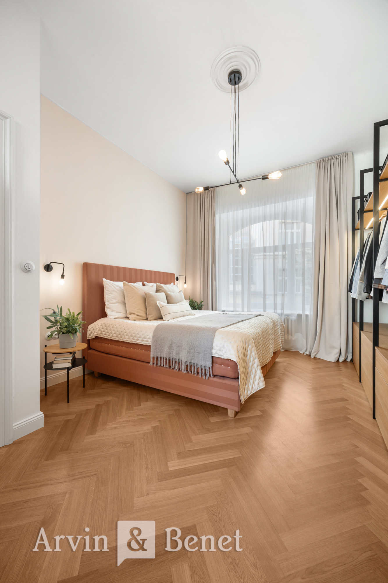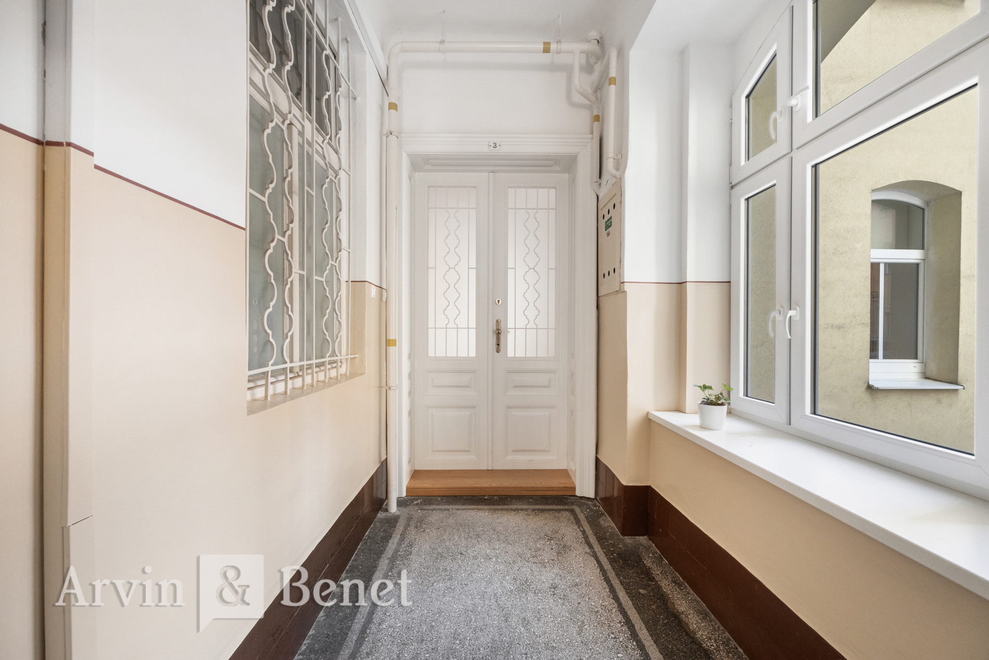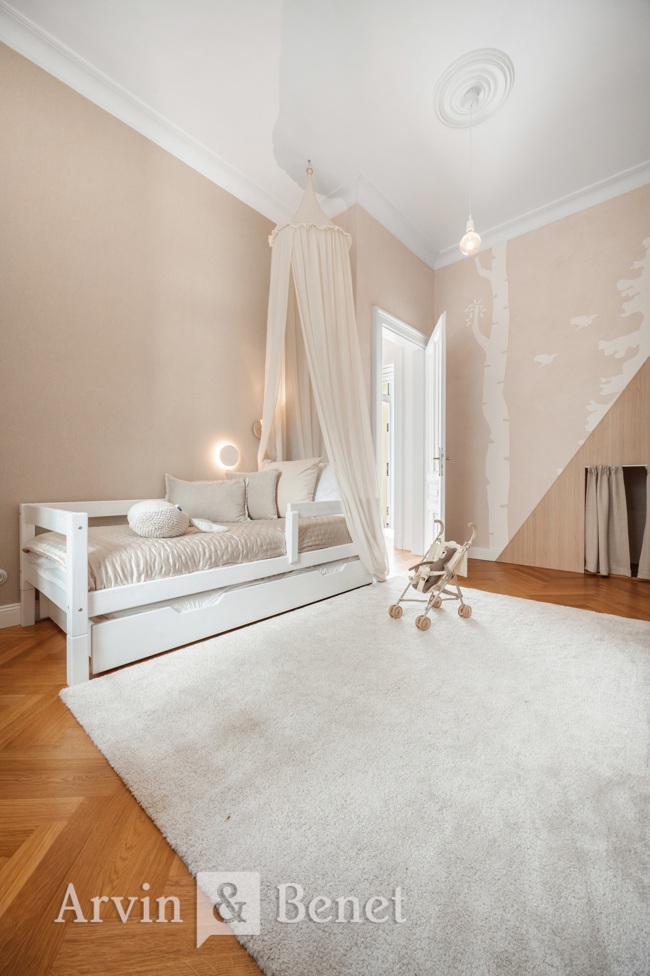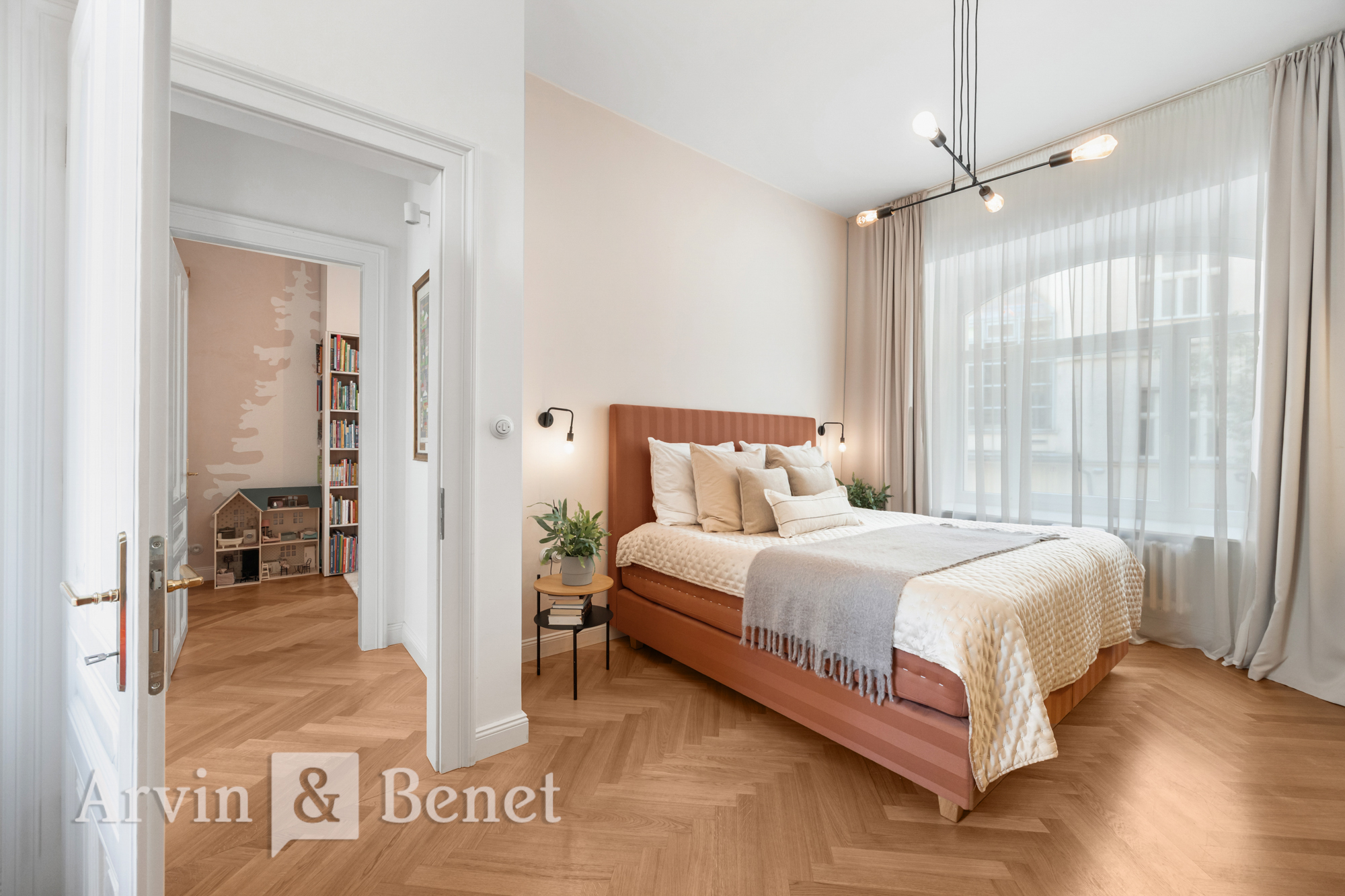 4-izbový byt v historickom dome po kompletnej rekonštrukcii, ktorá citlivo zachovala to, čo sa nedá postaviť znova – vysoké stropy so štukou a rozetami, originálne dvojkrídlové dvere s mosadzným kovaním a mliečnym sklom, dubové parkety v rybom vzore v celom byte.