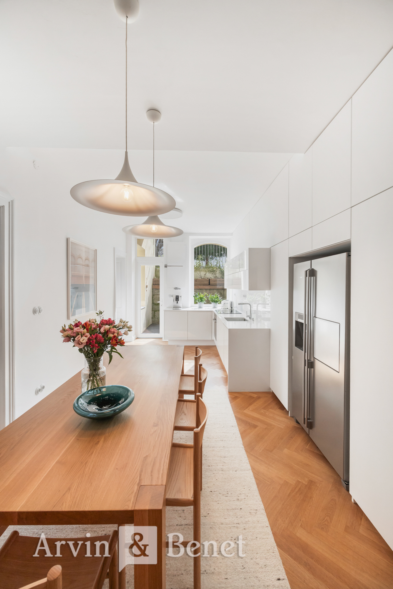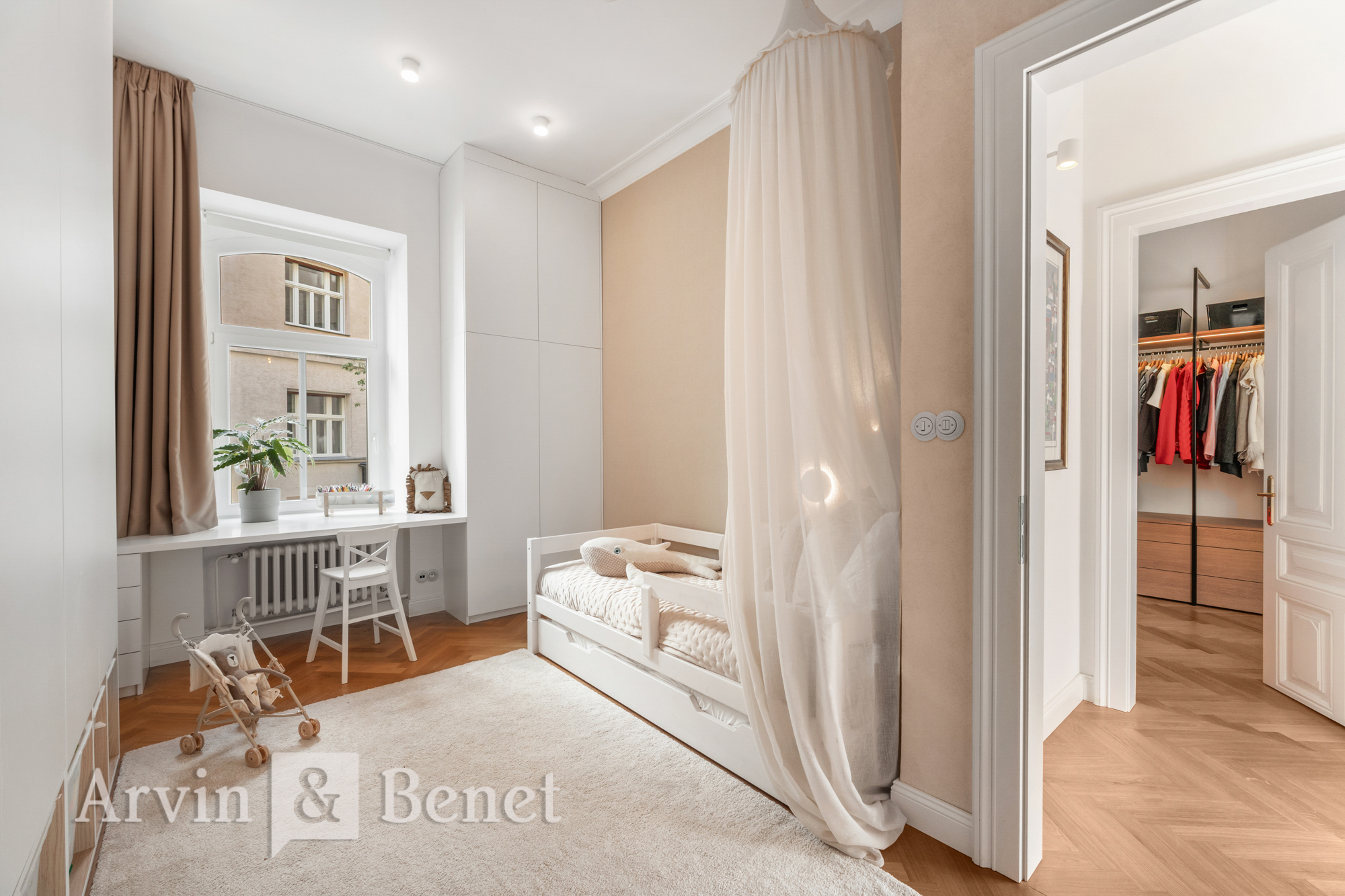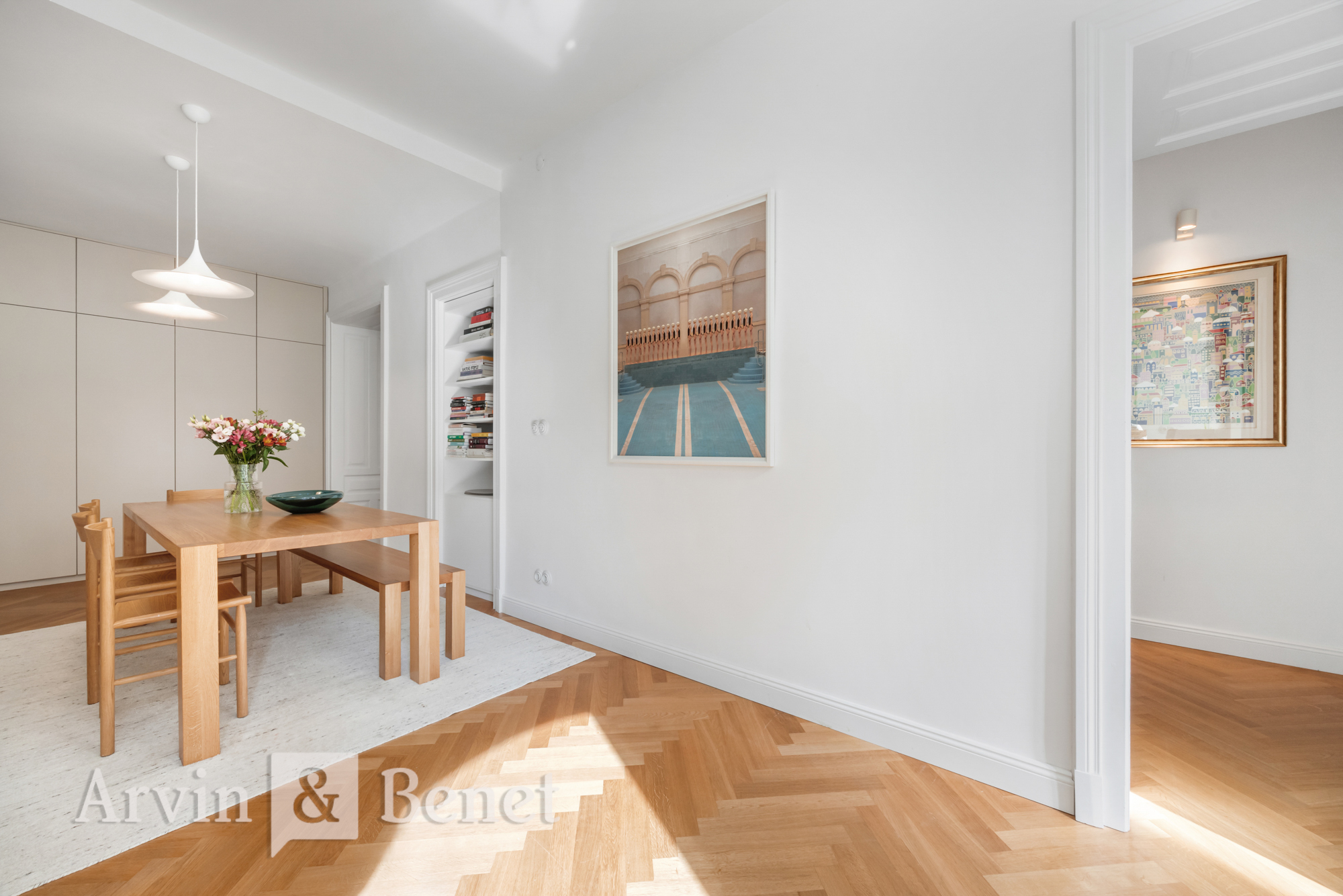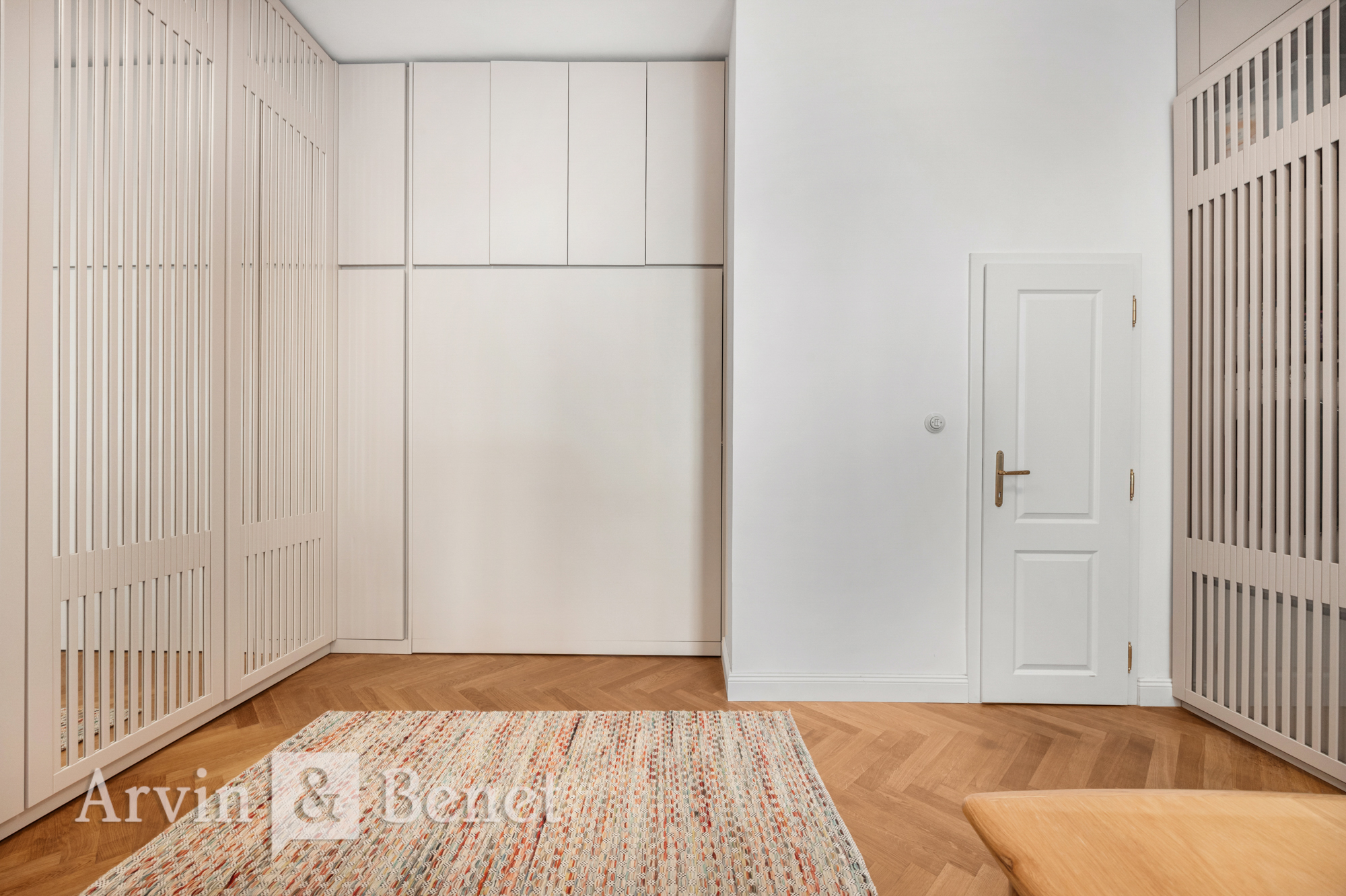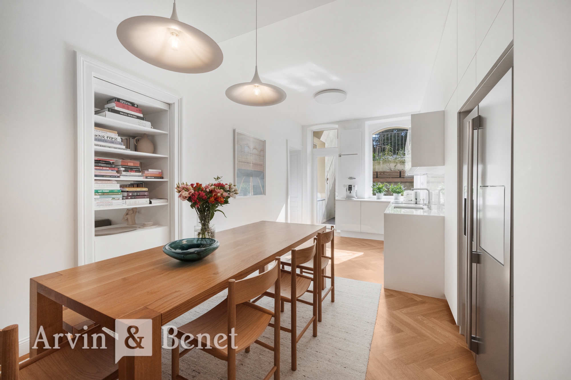 4-izbový byt v historickom dome po kompletnej rekonštrukcii, ktorá citlivo zachovala to, čo sa nedá postaviť znova – vysoké stropy so štukou a rozetami, originálne dvojkrídlové dvere s mosadzným kovaním a mliečnym sklom, dubové parkety v rybom vzore v celom byte.