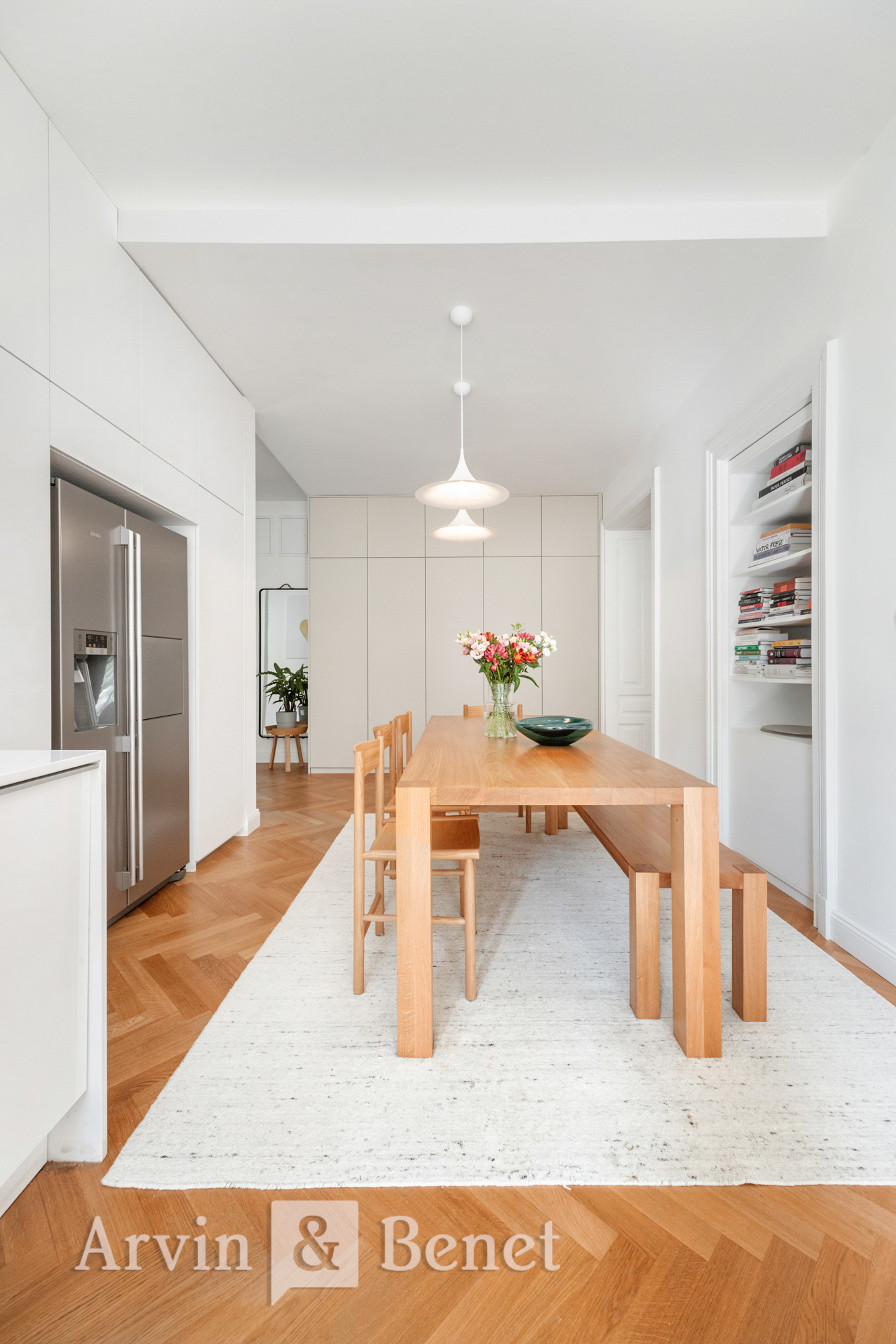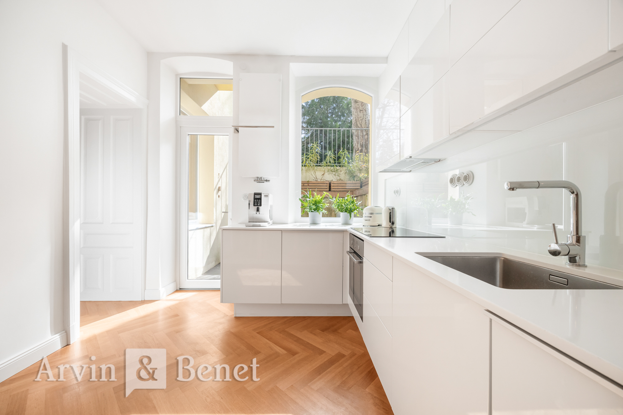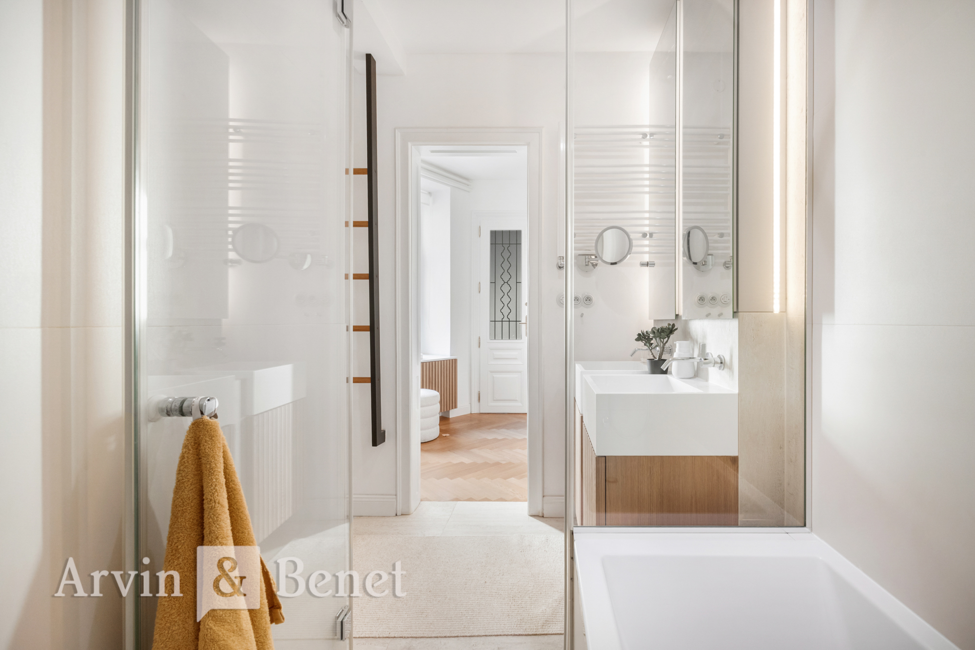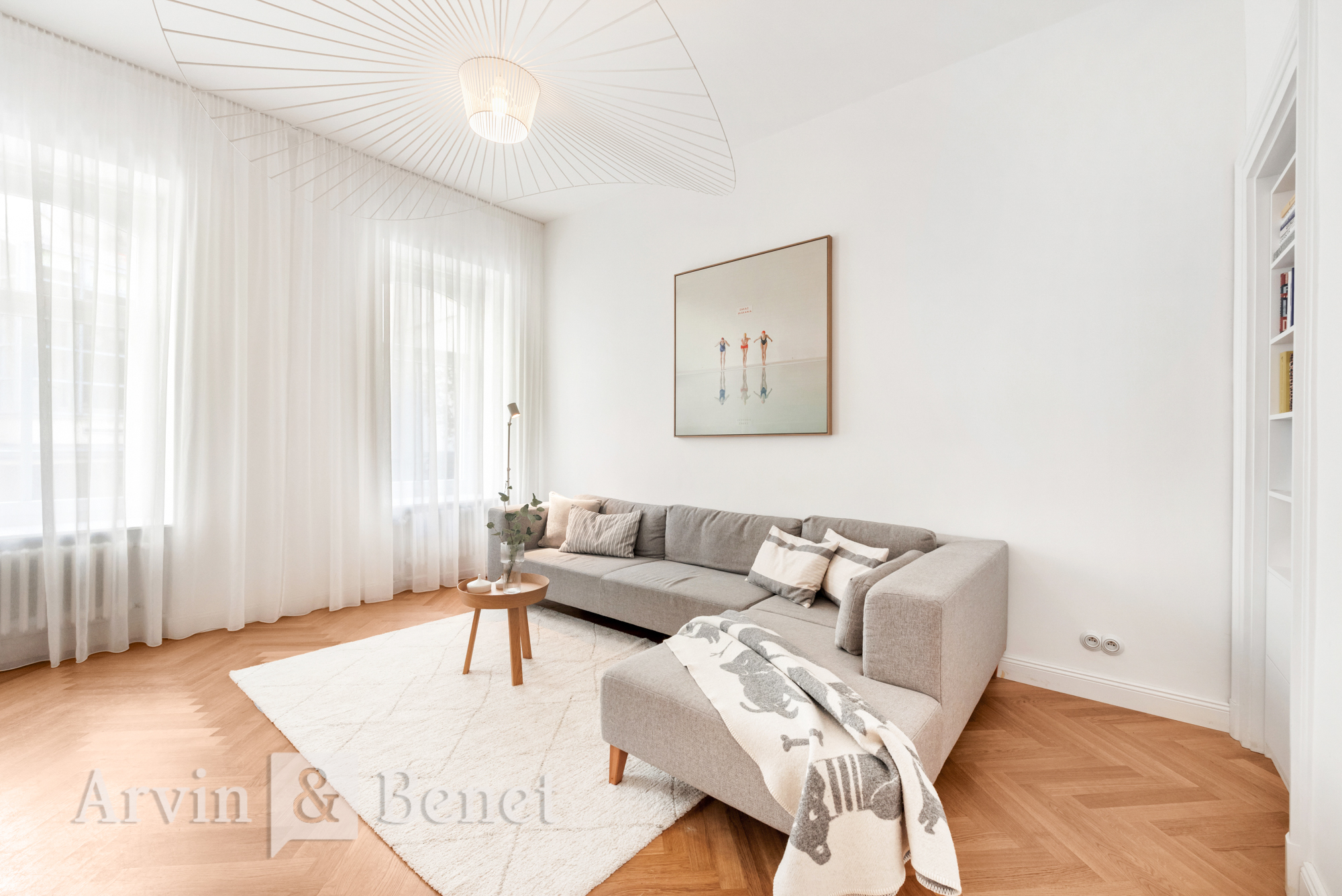 4-izbový byt v historickom dome po kompletnej rekonštrukcii, ktorá citlivo zachovala to, čo sa nedá postaviť znova – vysoké stropy so štukou a rozetami, originálne dvojkrídlové dvere s mosadzným kovaním a mliečnym sklom, dubové parkety v rybom vzore v celom byte.