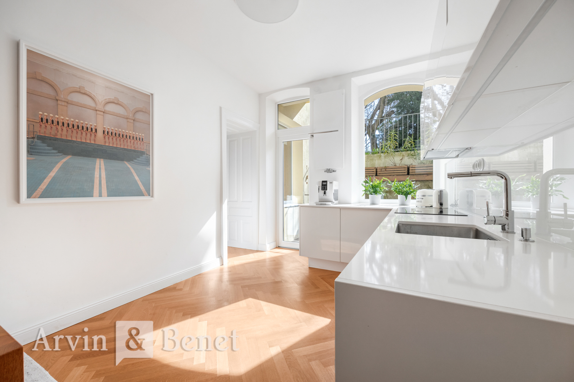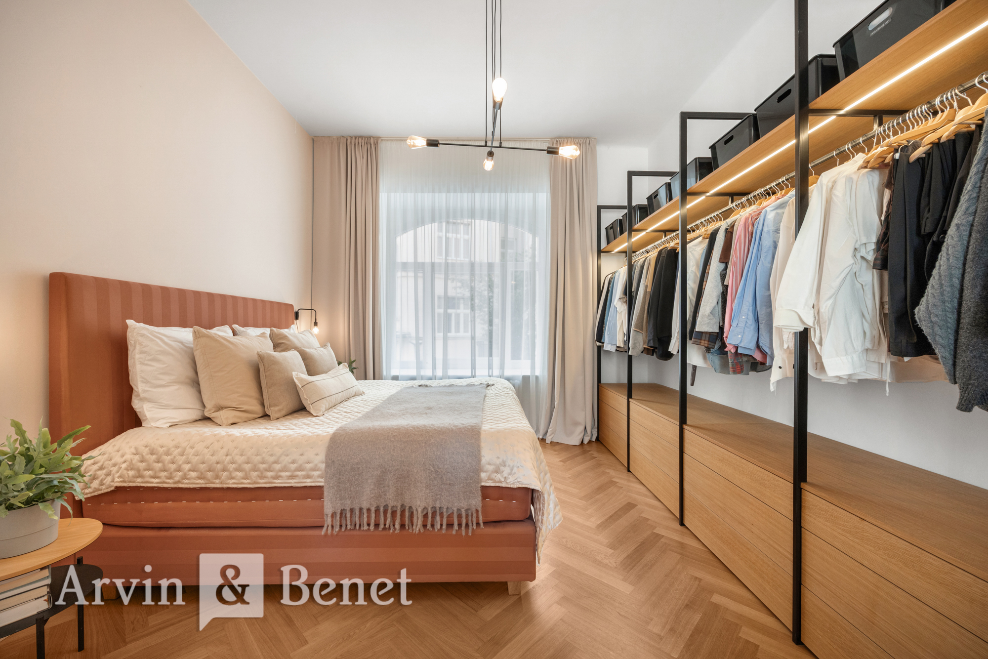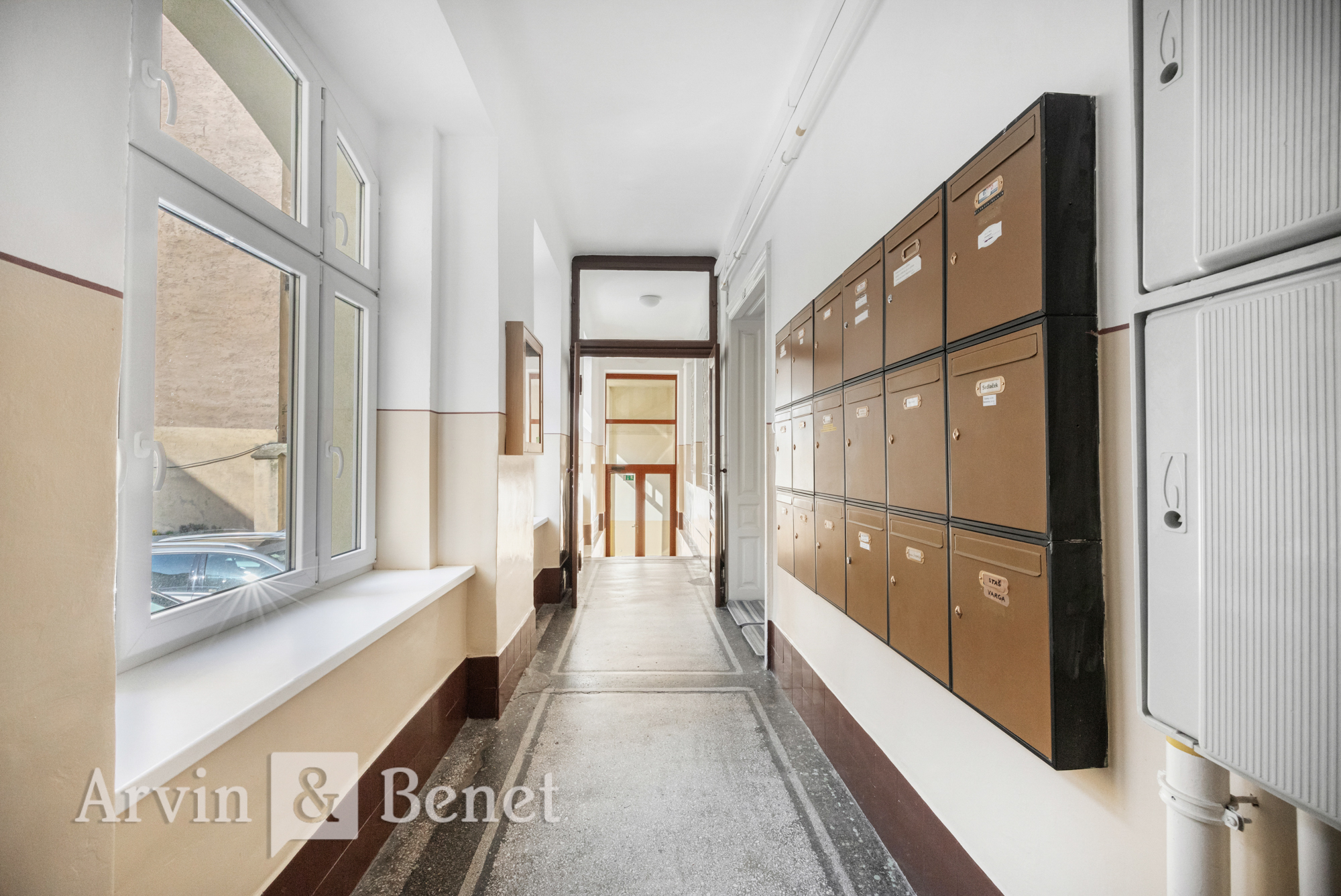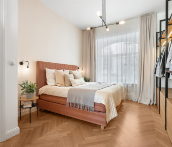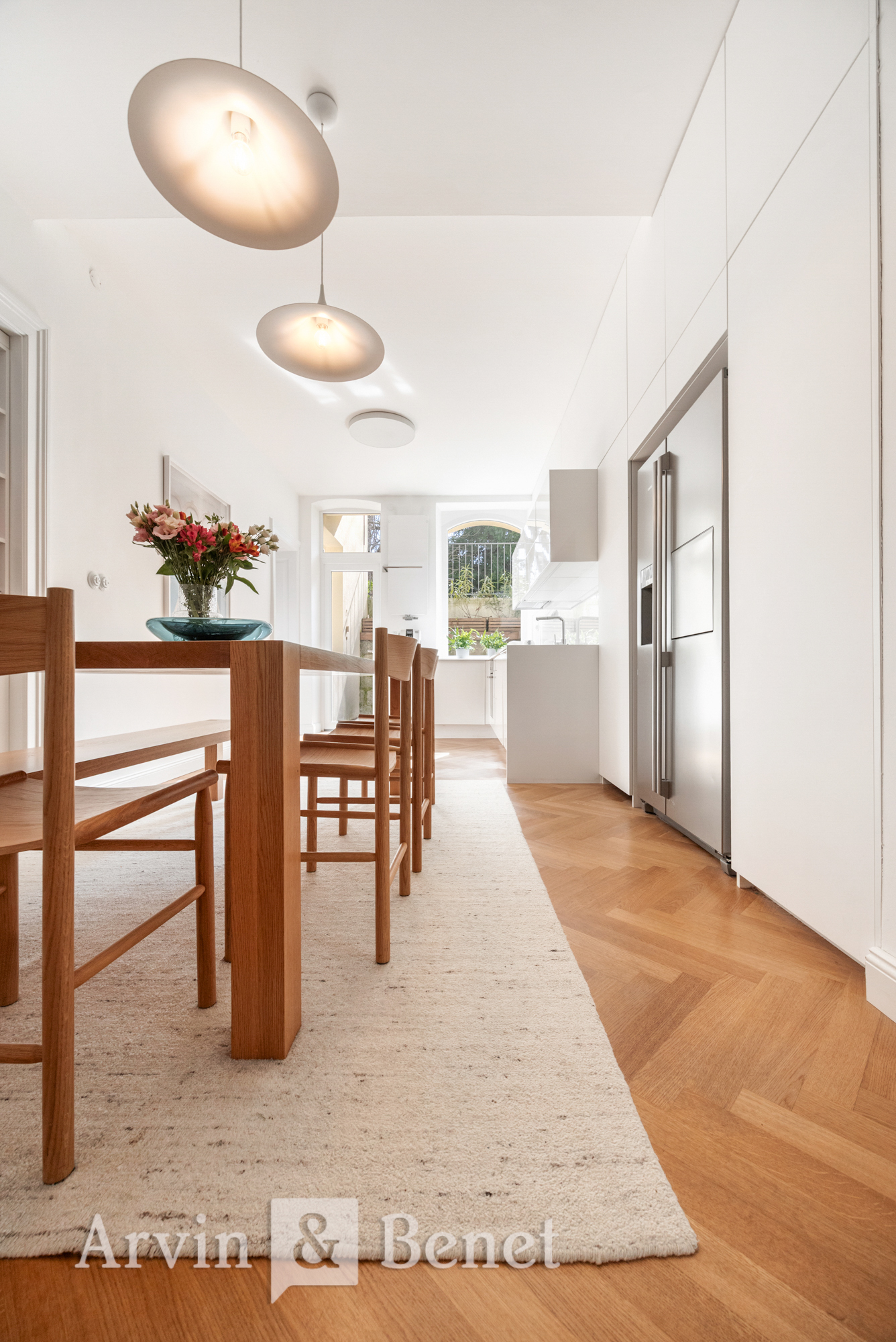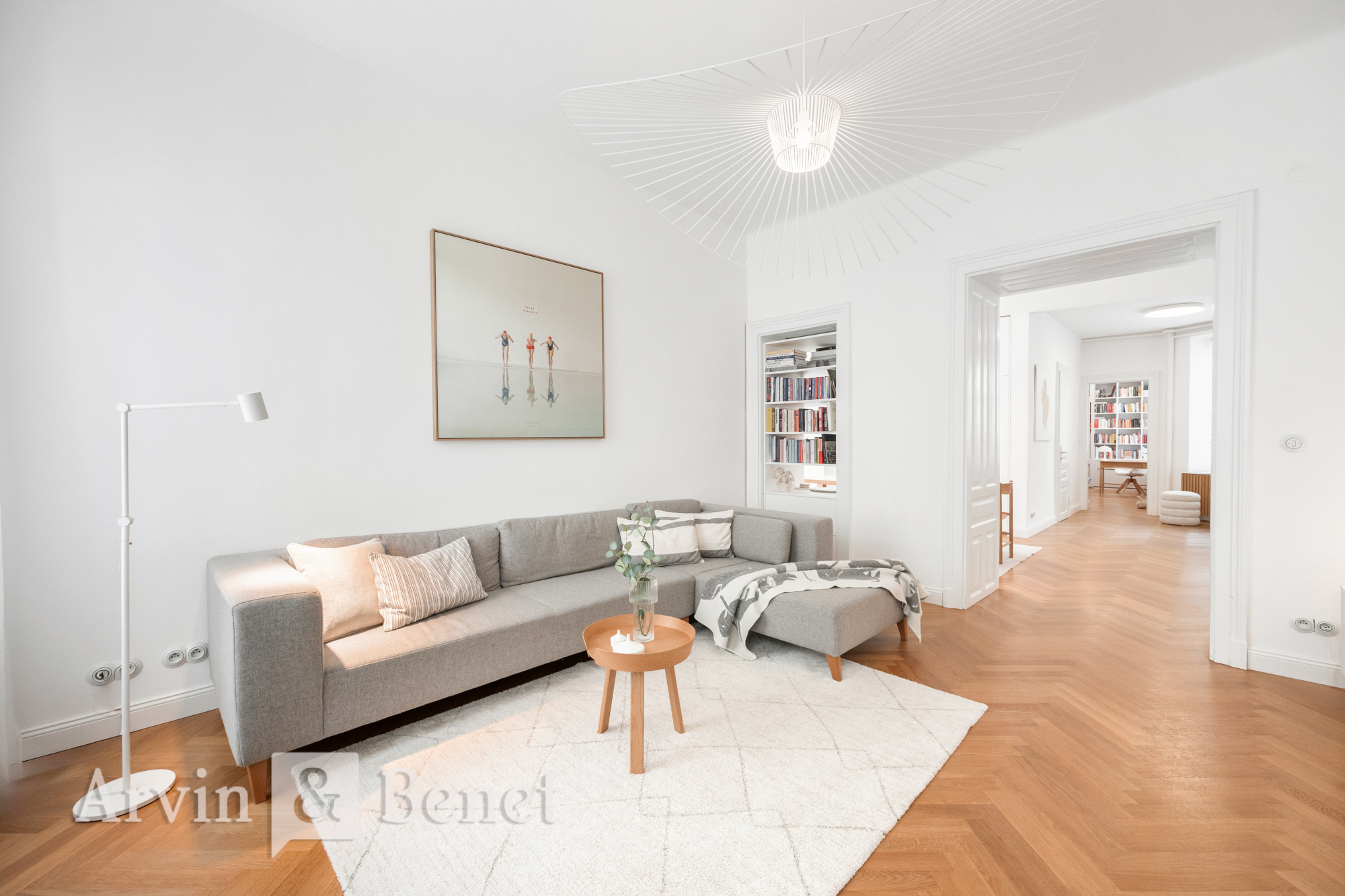 4-izbový byt v historickom dome po kompletnej rekonštrukcii, ktorá citlivo zachovala to, čo sa nedá postaviť znova – vysoké stropy so štukou a rozetami, originálne dvojkrídlové dvere s mosadzným kovaním a mliečnym sklom, dubové parkety v rybom vzore v celom byte.