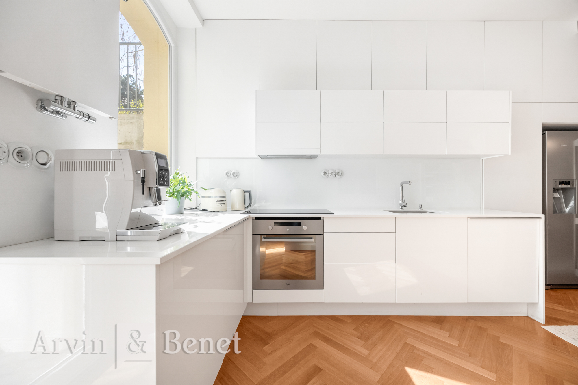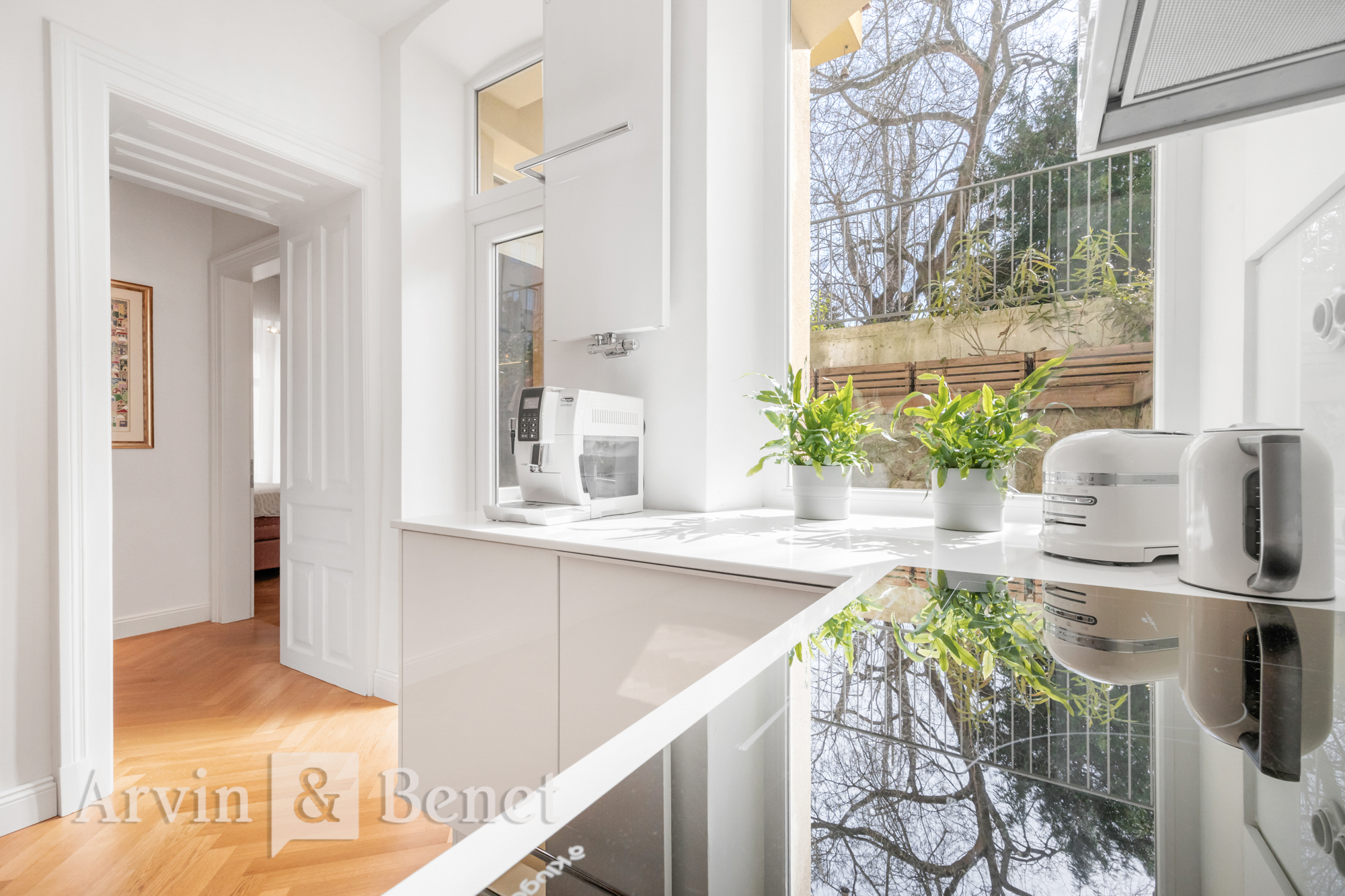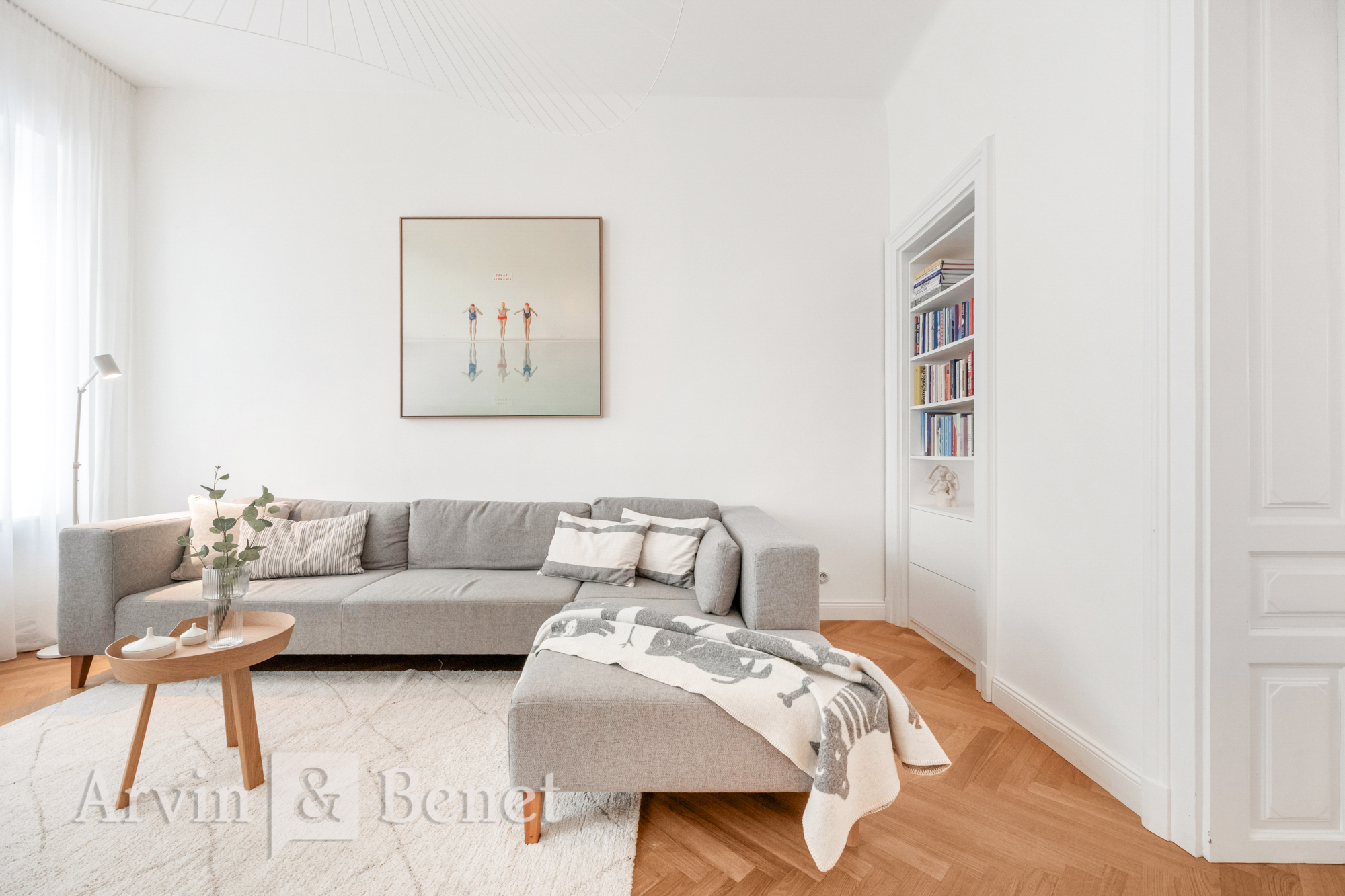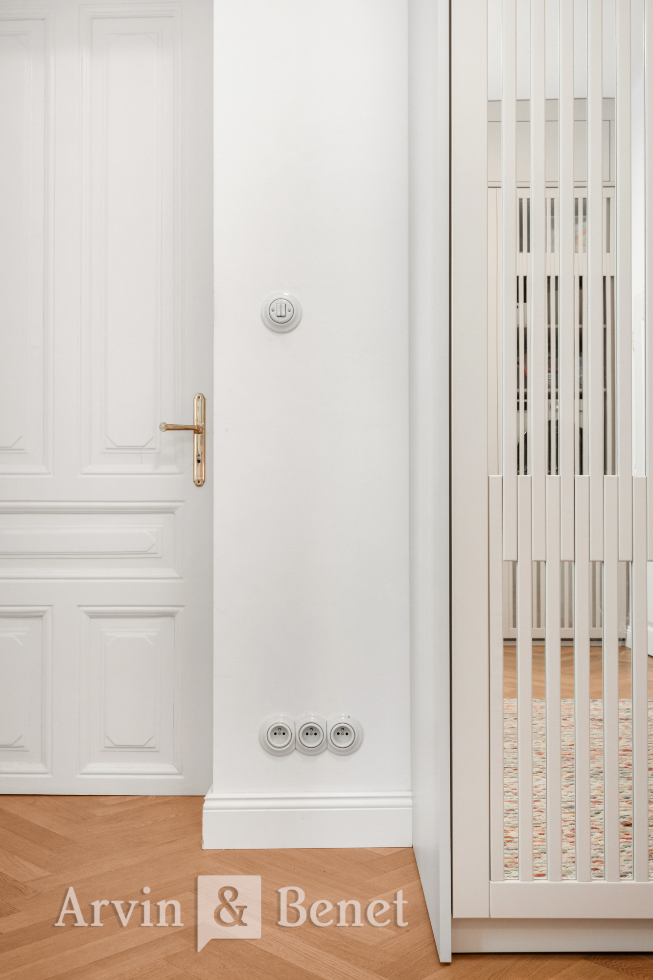 4-izbový byt v historickom dome po kompletnej rekonštrukcii, ktorá citlivo zachovala to, čo sa nedá postaviť znova – vysoké stropy so štukou a rozetami, originálne dvojkrídlové dvere s mosadzným kovaním a mliečnym sklom, dubové parkety v rybom vzore v celom byte.