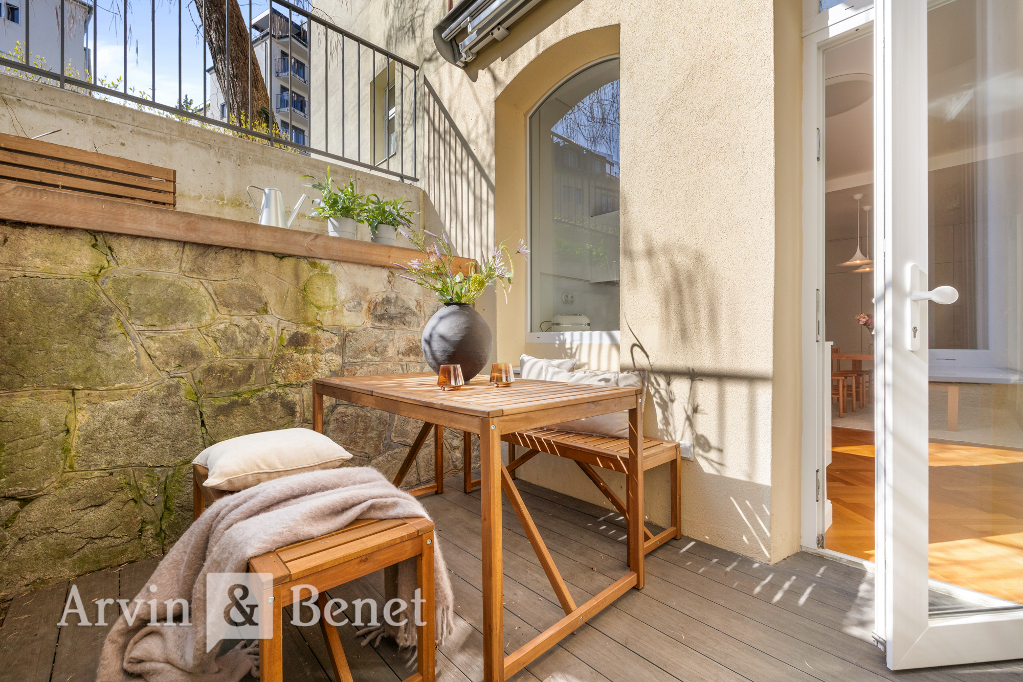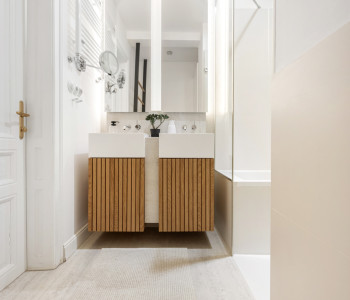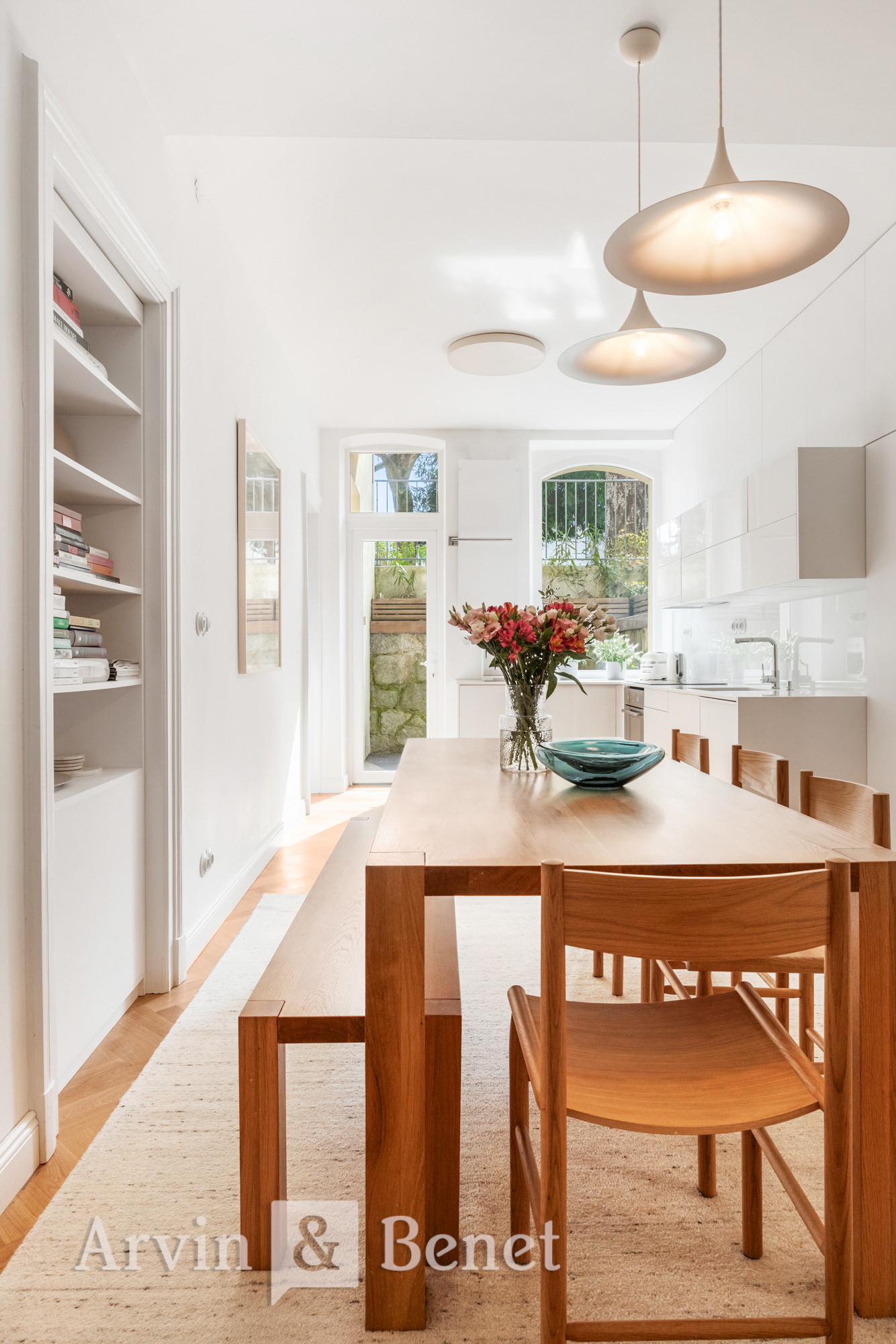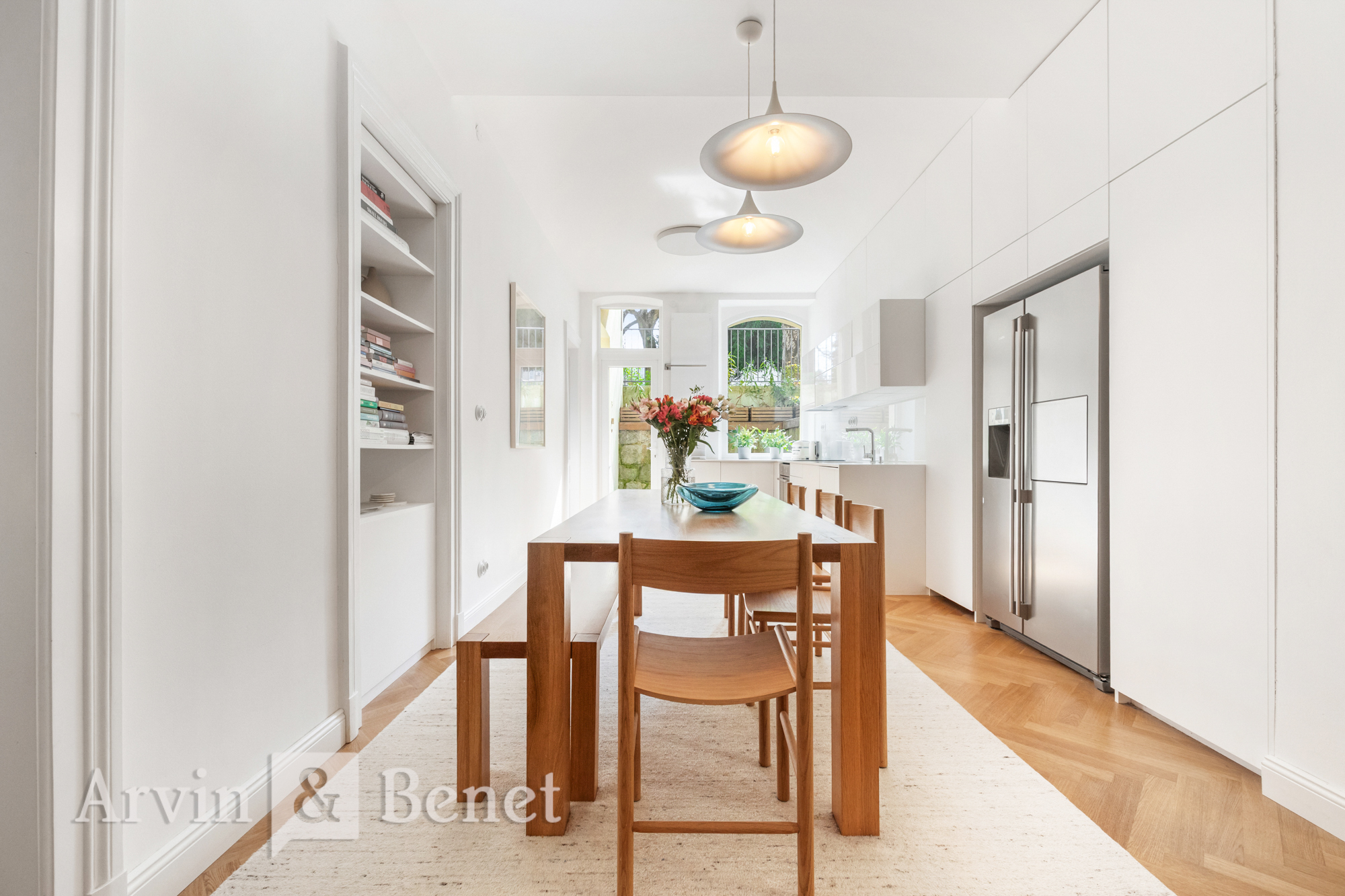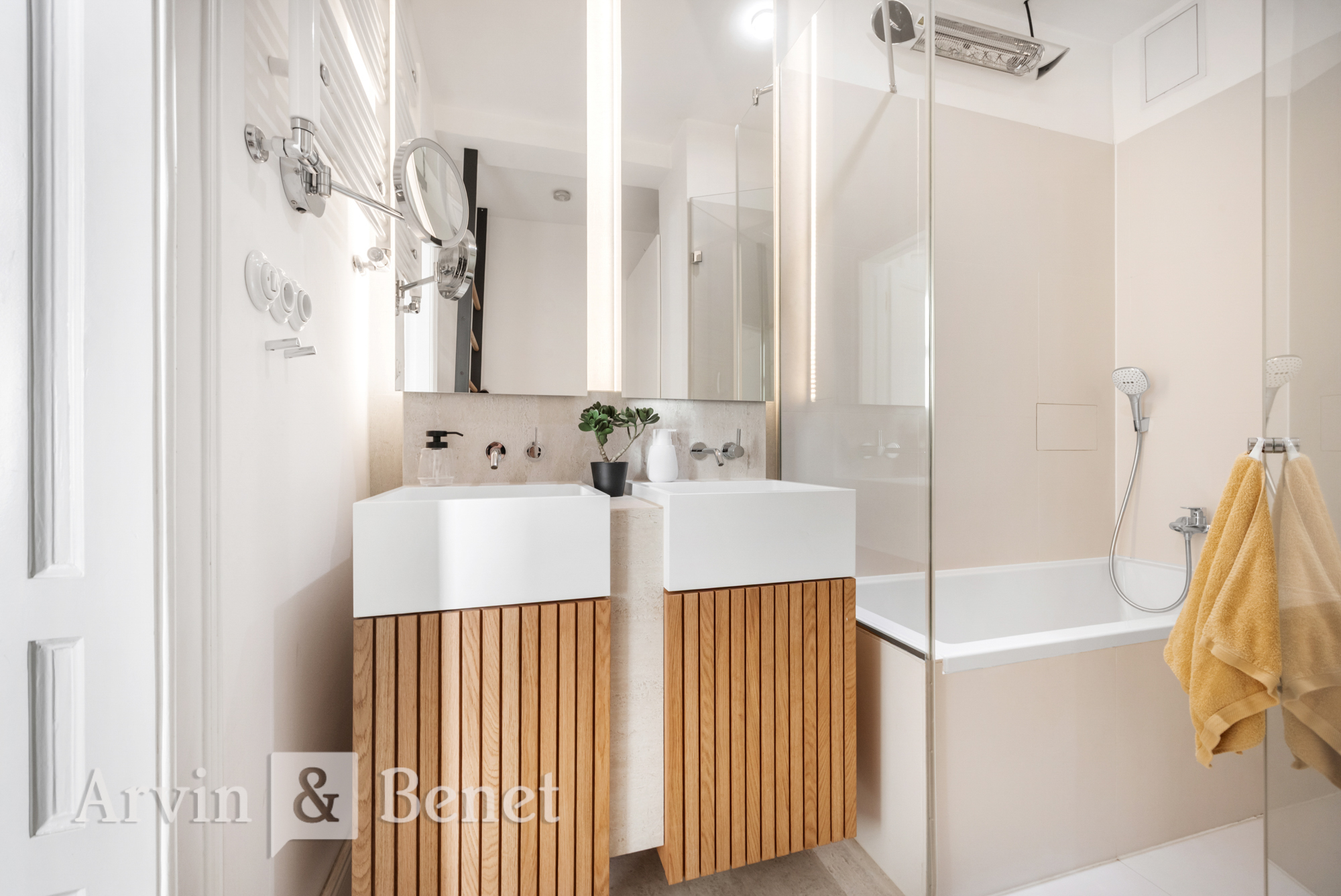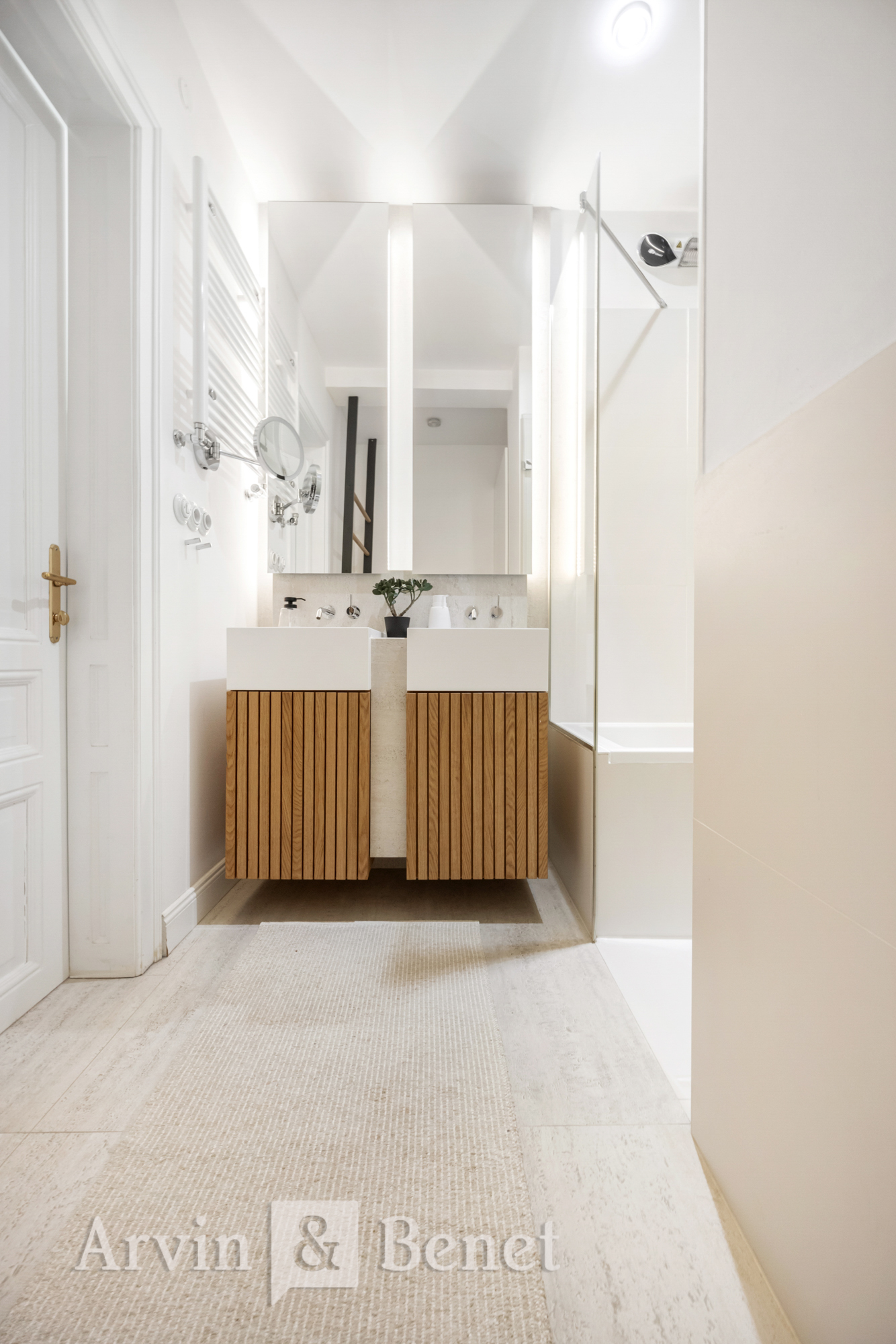 4-izbový byt v historickom dome po kompletnej rekonštrukcii, ktorá citlivo zachovala to, čo sa nedá postaviť znova – vysoké stropy so štukou a rozetami, originálne dvojkrídlové dvere s mosadzným kovaním a mliečnym sklom, dubové parkety v rybom vzore v celom byte.