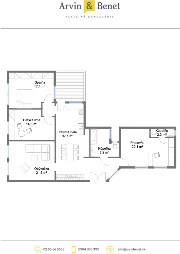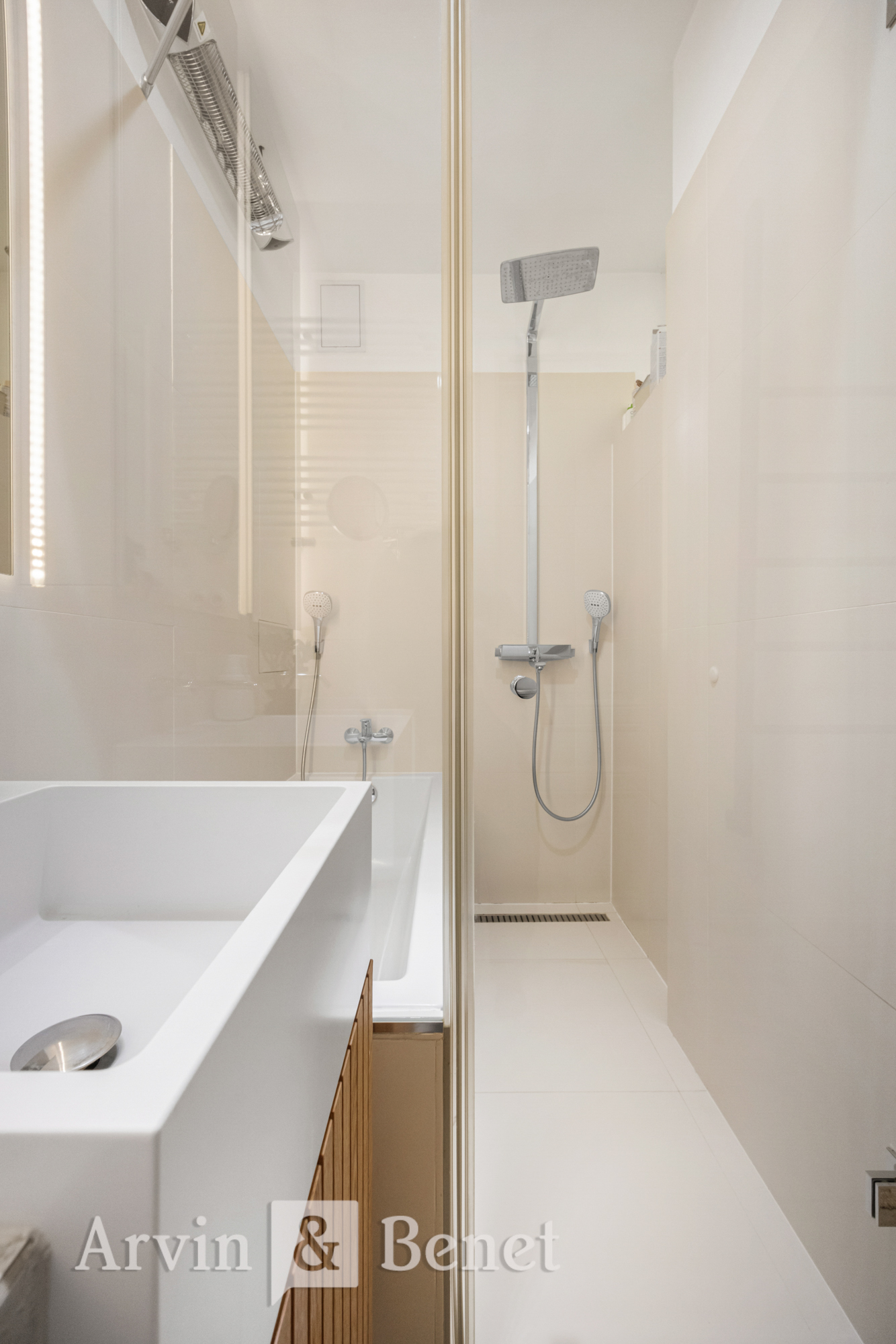 Reprezentatívna vstupná hala s prirodzeným svetlom prepája celý byt. Veľkorysá obývačka plynule nadväzuje na jedáleň a kuchyňu. Samostatná pracovňa s knižnicou po strop. Spálňa s walk-in šatníkom. Detská izba s nábytkom na mieru. Hlavná kúpeľňa s vaňou, sprchovým kútom a dvojitým umývadlom na dubových skrinkách. Druhá kúpeľňa so sprchovým kútom.