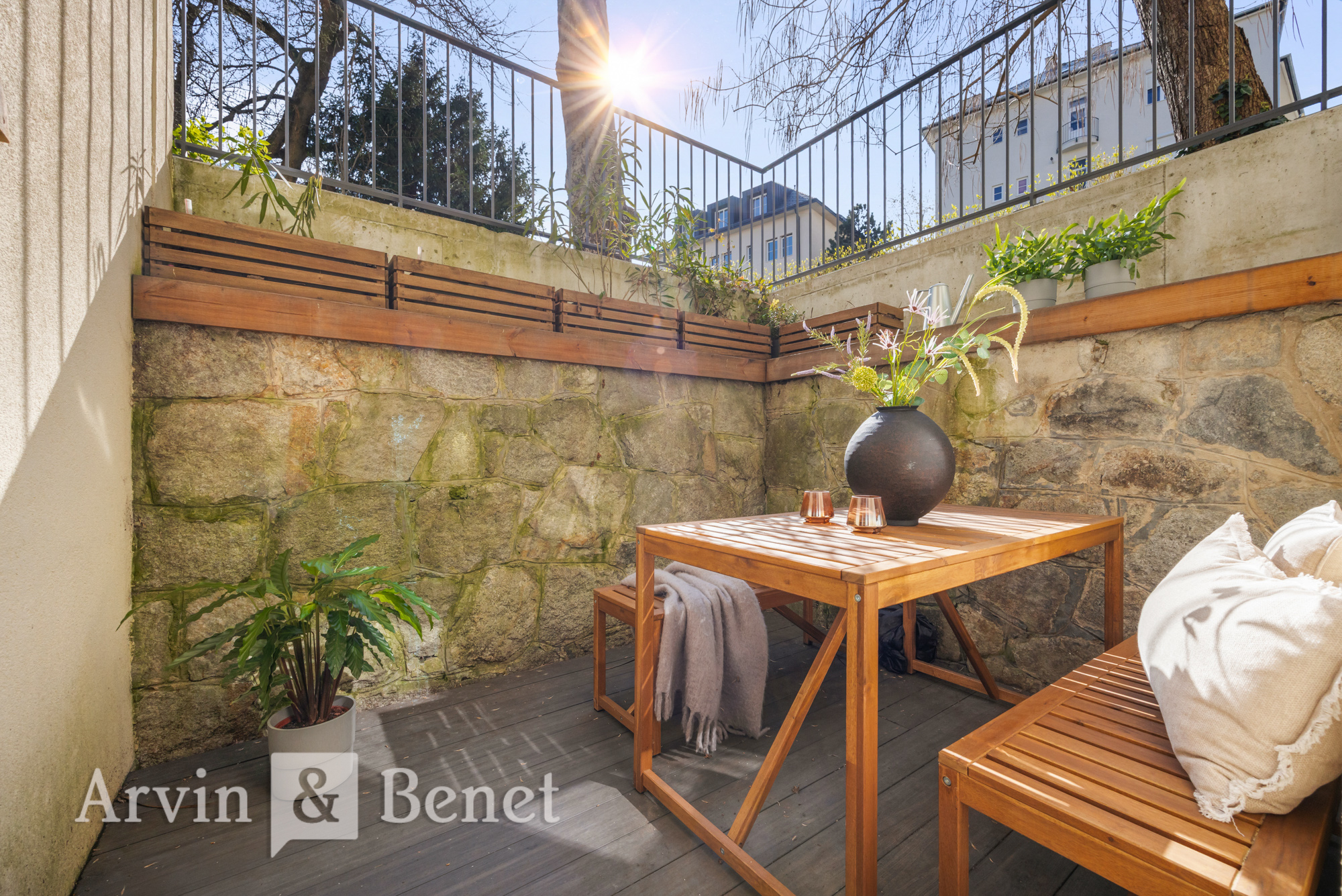 Z kuchyne na mieru sa vychádza priamo na súkromnú slnečnú terasu s automatickou markízou, drevenou podlahou a kamenným múrom. Bez prístupu cudzích ľudí.