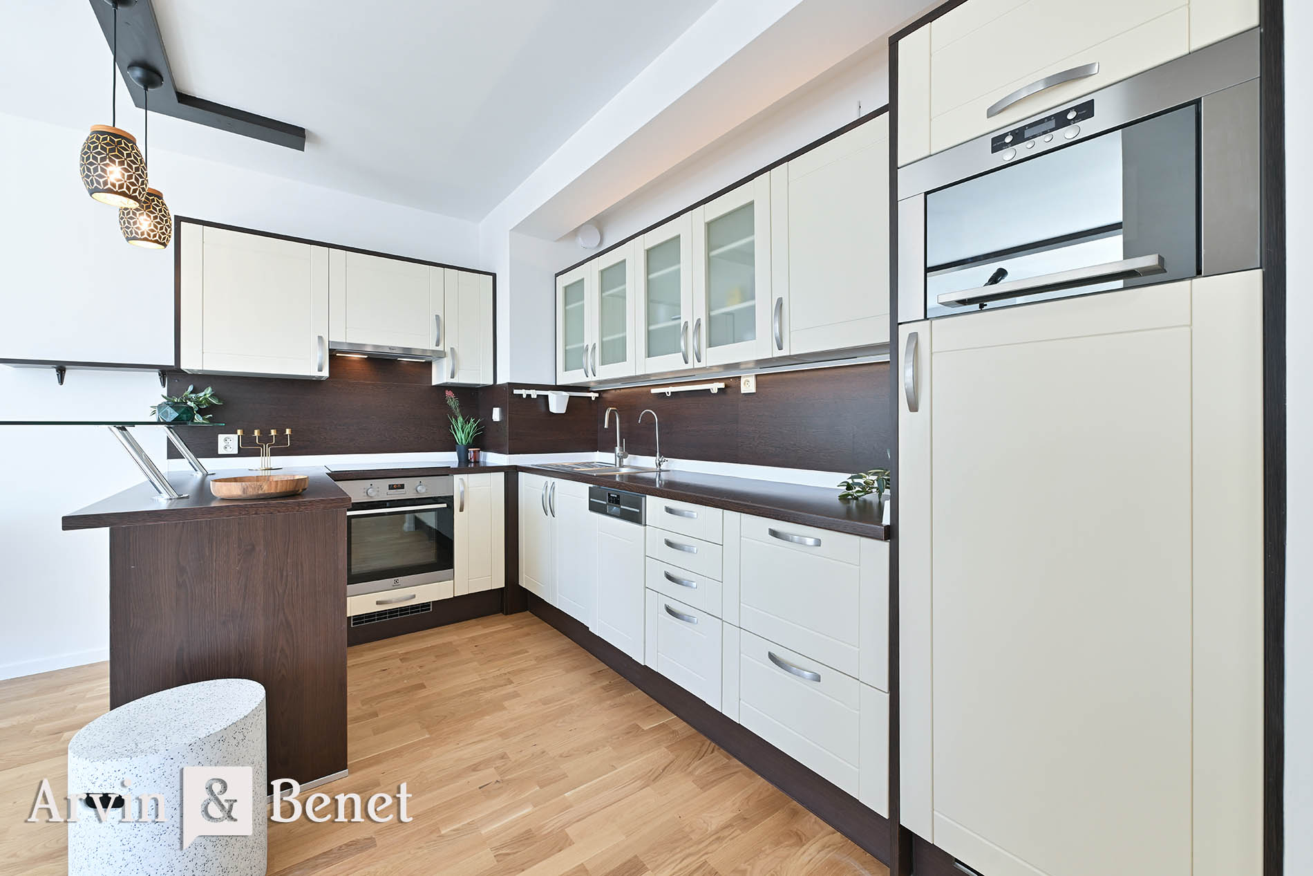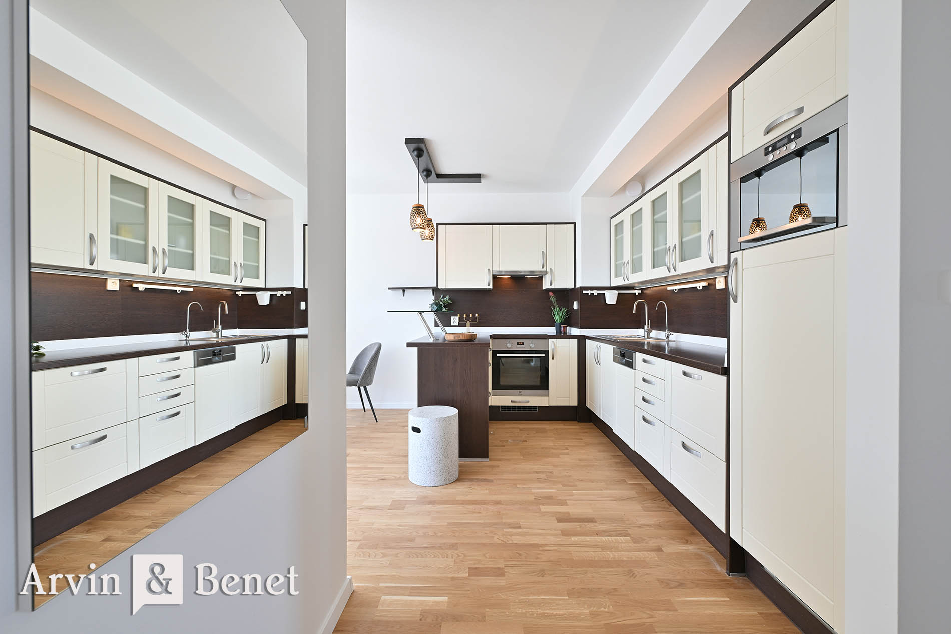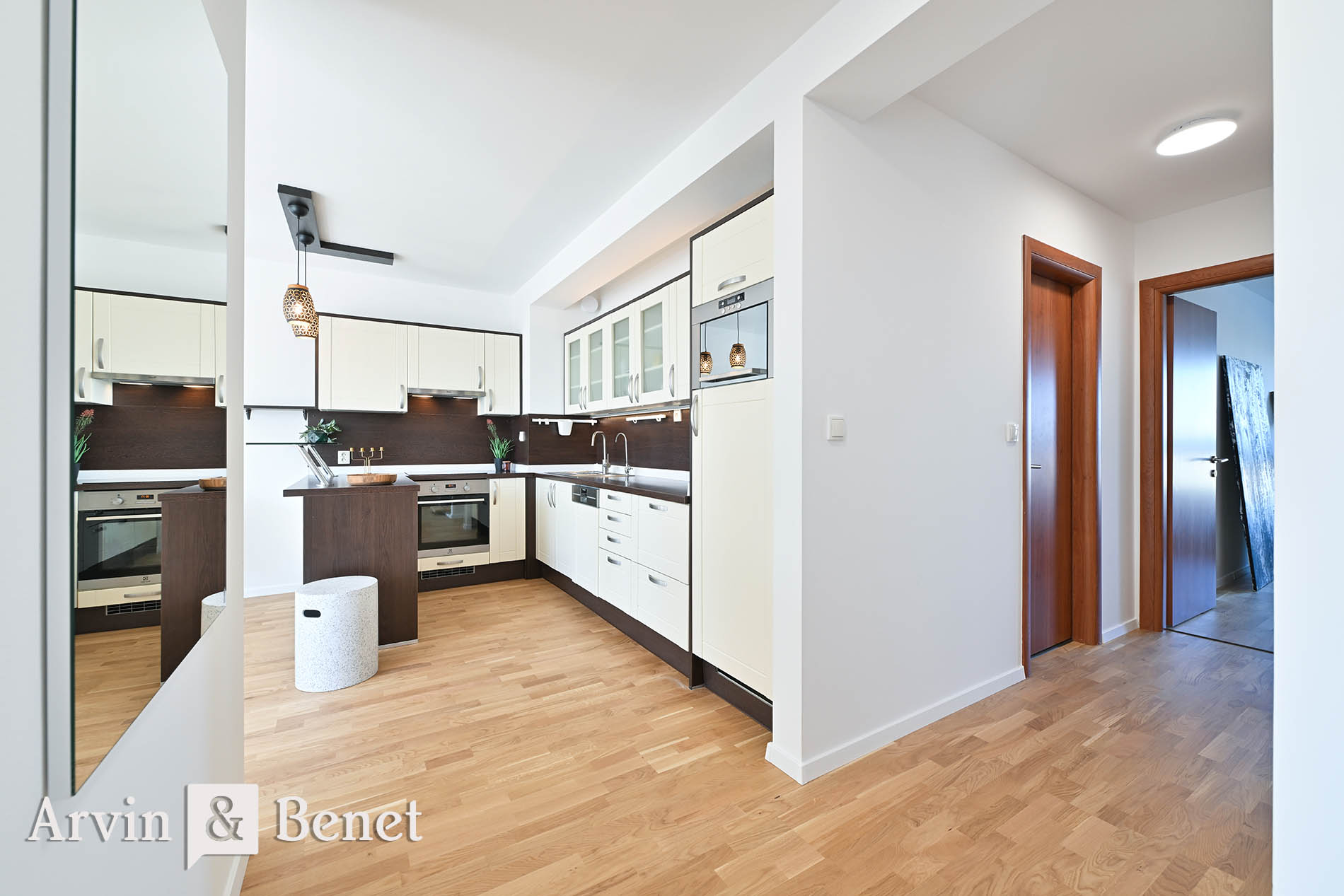 Priamo oproti vstupu sa nachádza otvorený priestor, prepájajúci kuchyňu a obývačku. Kuchyňa je v nadčasovej kombinácii béžovej a dreva, je vyrobená na mieru s maximálnym využitím priestoru, disponuje všetkými štandardnými spotrebičmi. Nechýba tu ani obľúbený barový pult na rýchle raňajky.