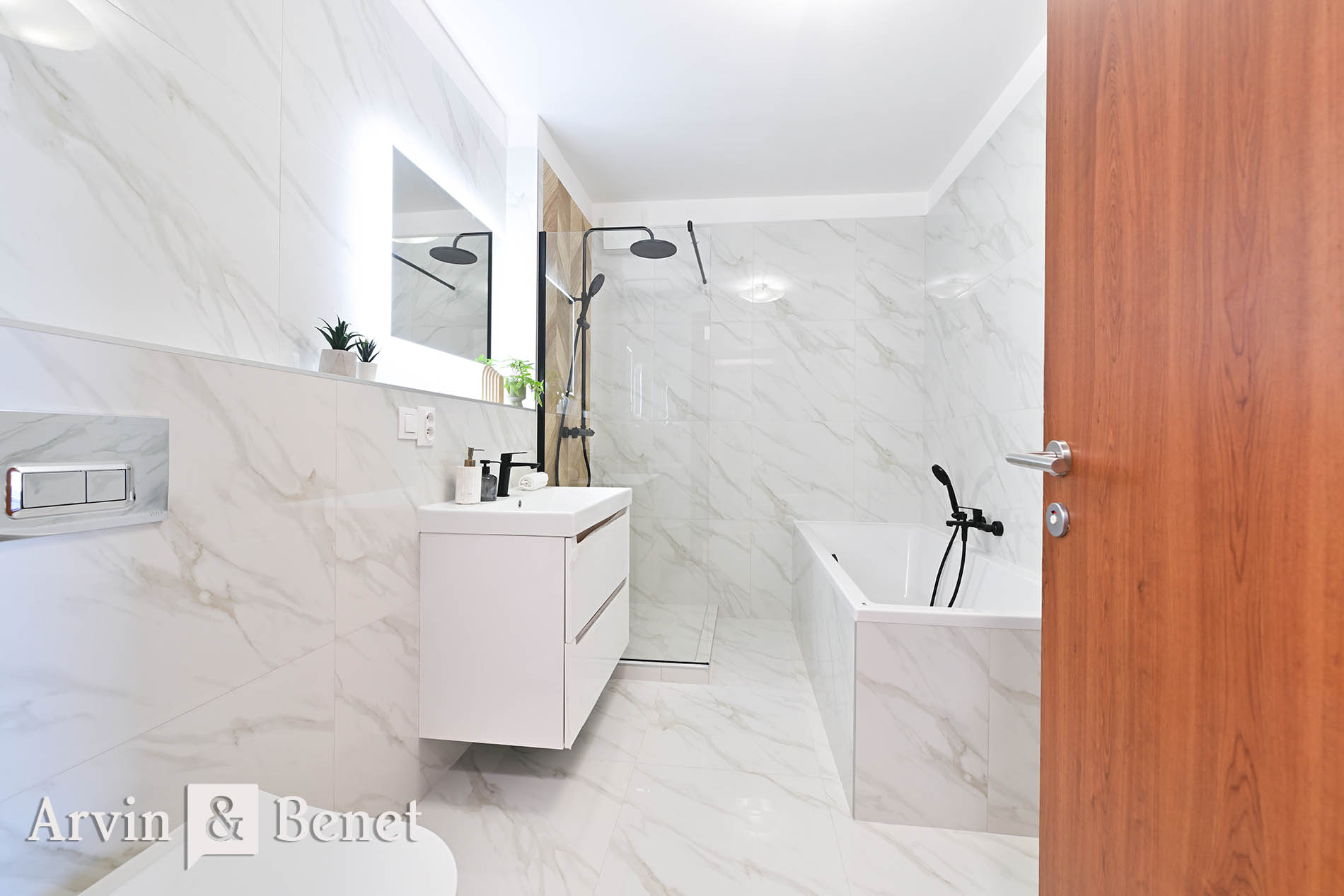 Priestranná kúpeľňa prešla v roku 2026 kompletnou modernizáciou. V porovnaní s inými bytmi sa tu priestorom nešetrilo. Ponúka vaňu aj sprchový kút a tiež dostatok miesta pre práčku so sušičkou. Oproti kúpeľni sa nachádza šatník. Vstup z chodby umožňuje jeho využitie pre celú rodinu.