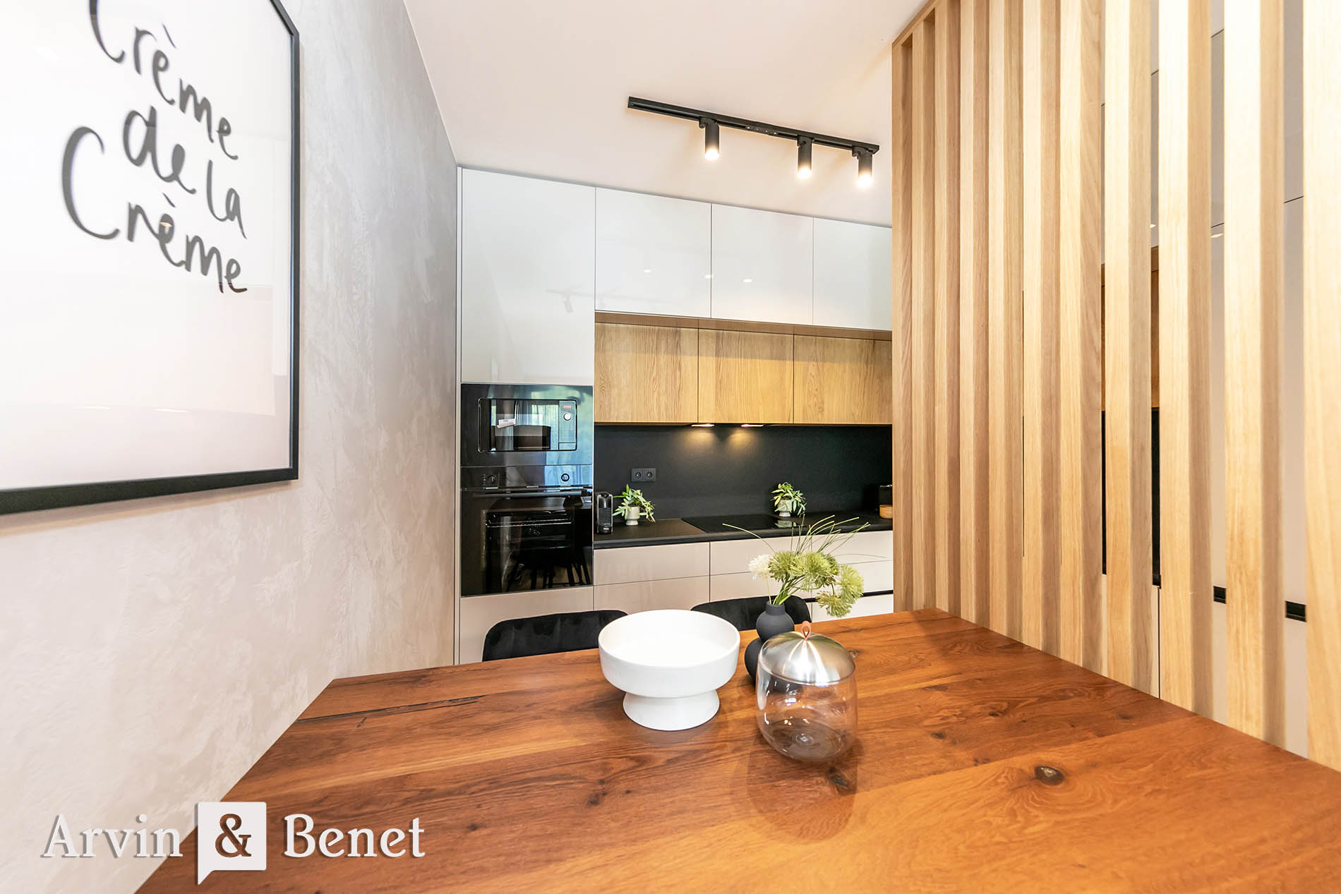 Byt je plne zariadený nábytkom vyrobeným na mieru podľa návrhu architekta. Ak máte