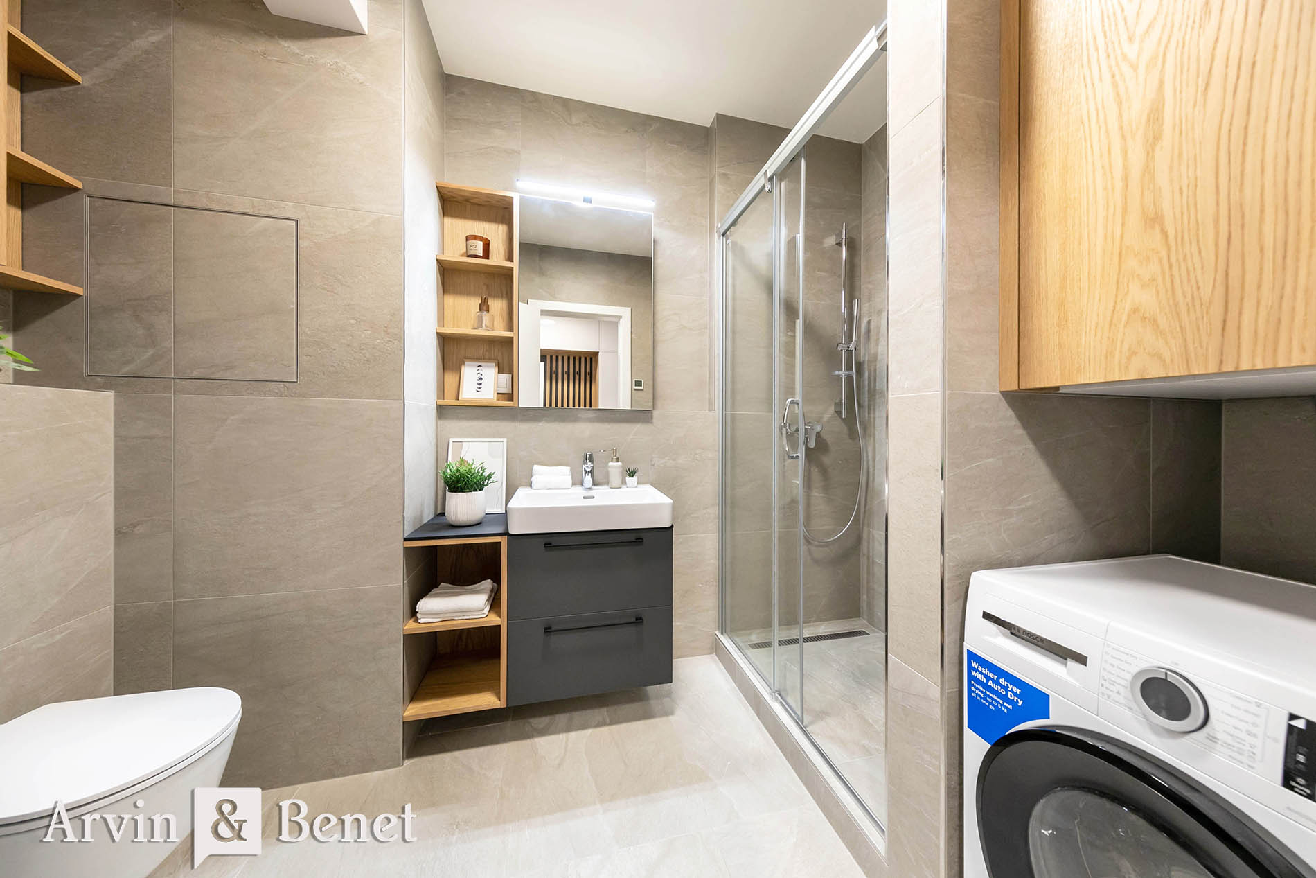 nachádza moderná kúpeľňa s priestranným sprchovým kútom a práčkou so