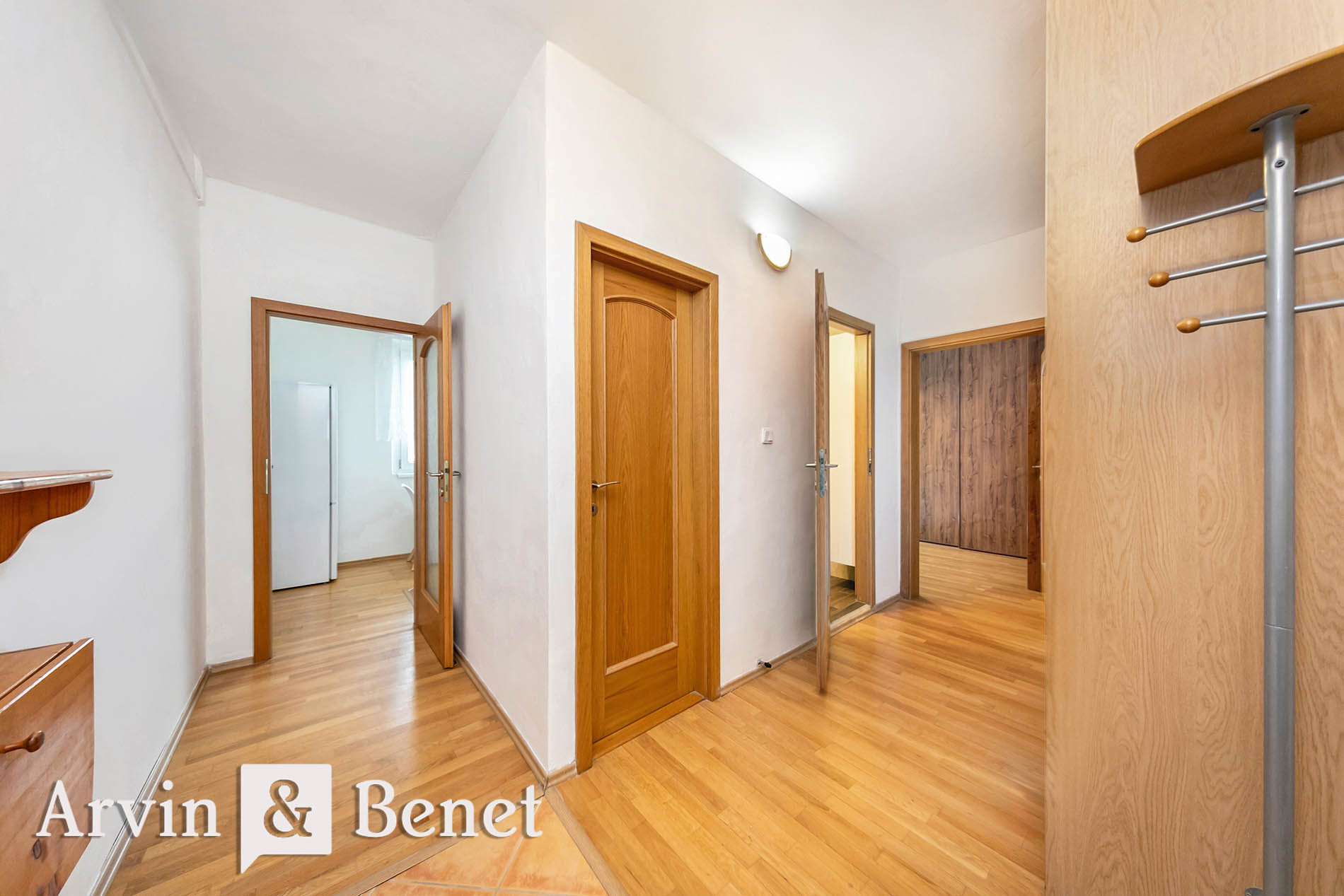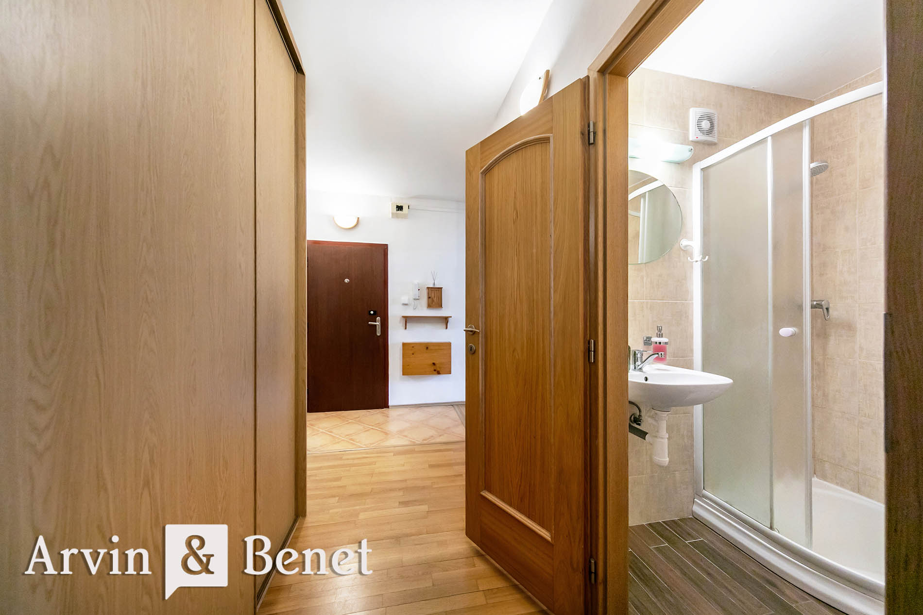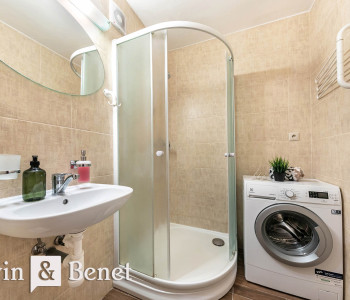 Kuchyňa je plne vybavená spotrebičmi a doplnená o praktické jedálenské sedenie. Priestranná chodba je obohatená o veľkú vstavanú skriňu na mieru, v ktorej si môžete uložiť všetky veci každodenného života. Komfort bývania zvyšuje kúpeľňa so sprchovacím kútom a práčkou, ktorá je oddelená od toalety.