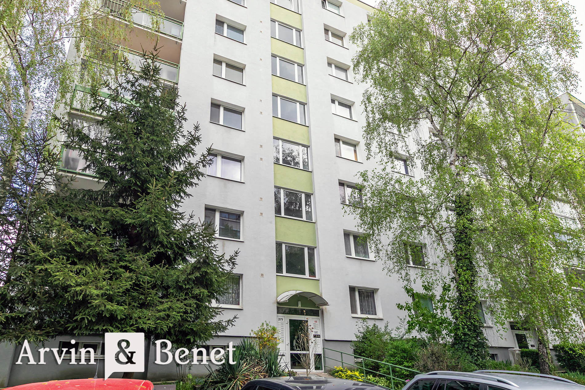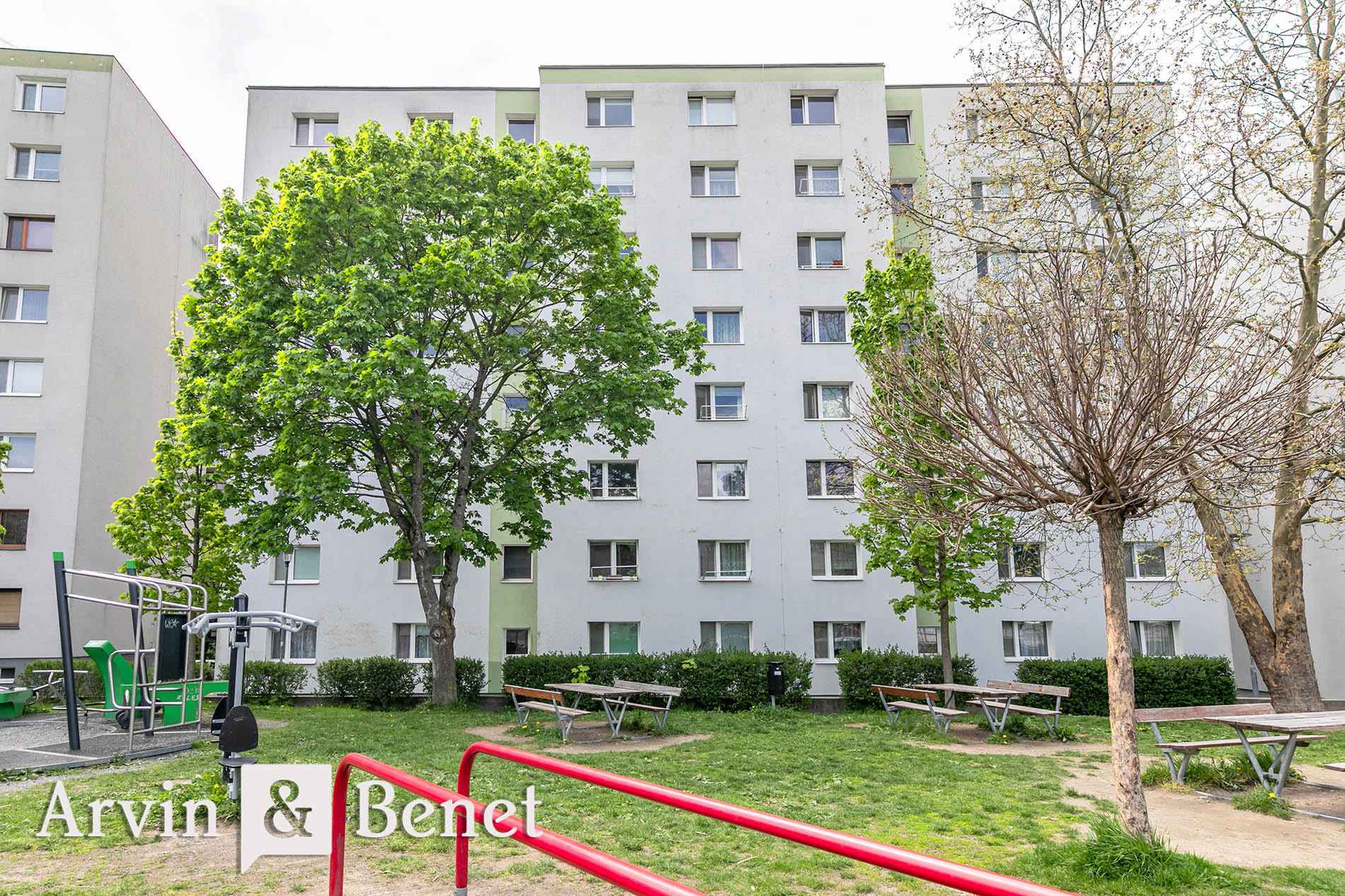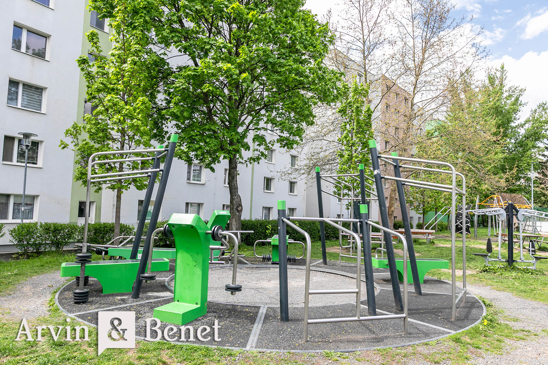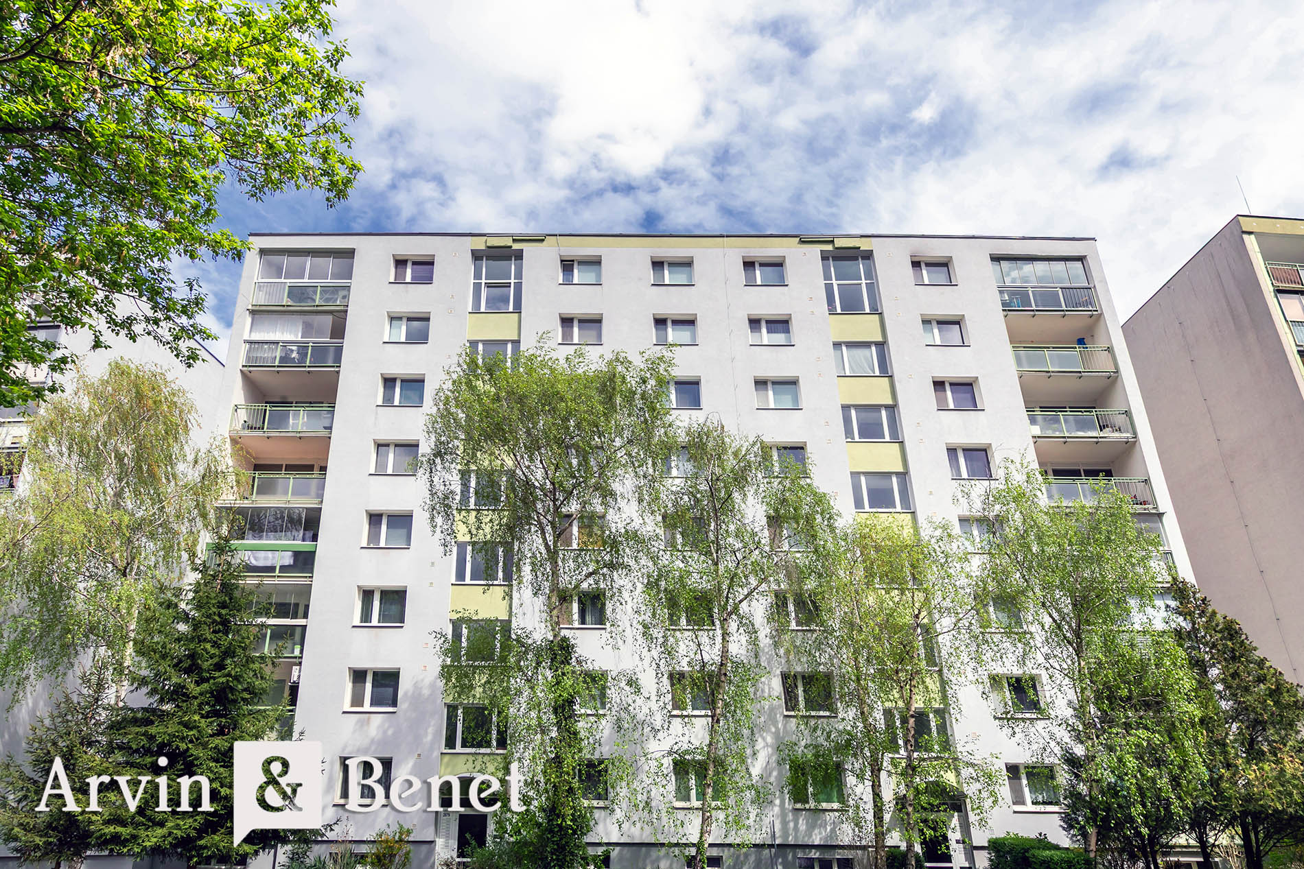 Byt sa nachádza na 1. poschodí a ponúka príjemné výhľady do zelene a neďalekého parku. Vďaka oknám orientovaným na dve svetové strany je interiér krásne presvetlený a vzdušný počas celého dňa.