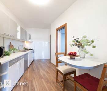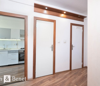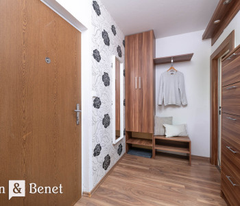 Byt disponuje praktickou a prehľadnou dispozíciou. Dominantou je veľká vstupná chodba, z ktorej sa plynulo vstupuje do spálne a obývacej izby. Obytná časť je tak prirodzene oddelená, pričom každá miestnosť má dostatok súkromia. Z chodby sa ďalej prechádza do menšej predsiene, ktorá slúži ako funkčný prechod do kúpeľne s vaňou a samostatnej toalety. Kuchyňa je riešená ako samostatná miestnosť s jedálenským stolom, pričom jej veľkým benefitom je priamy vstup na predzáhradku s altánkom.