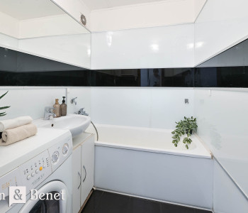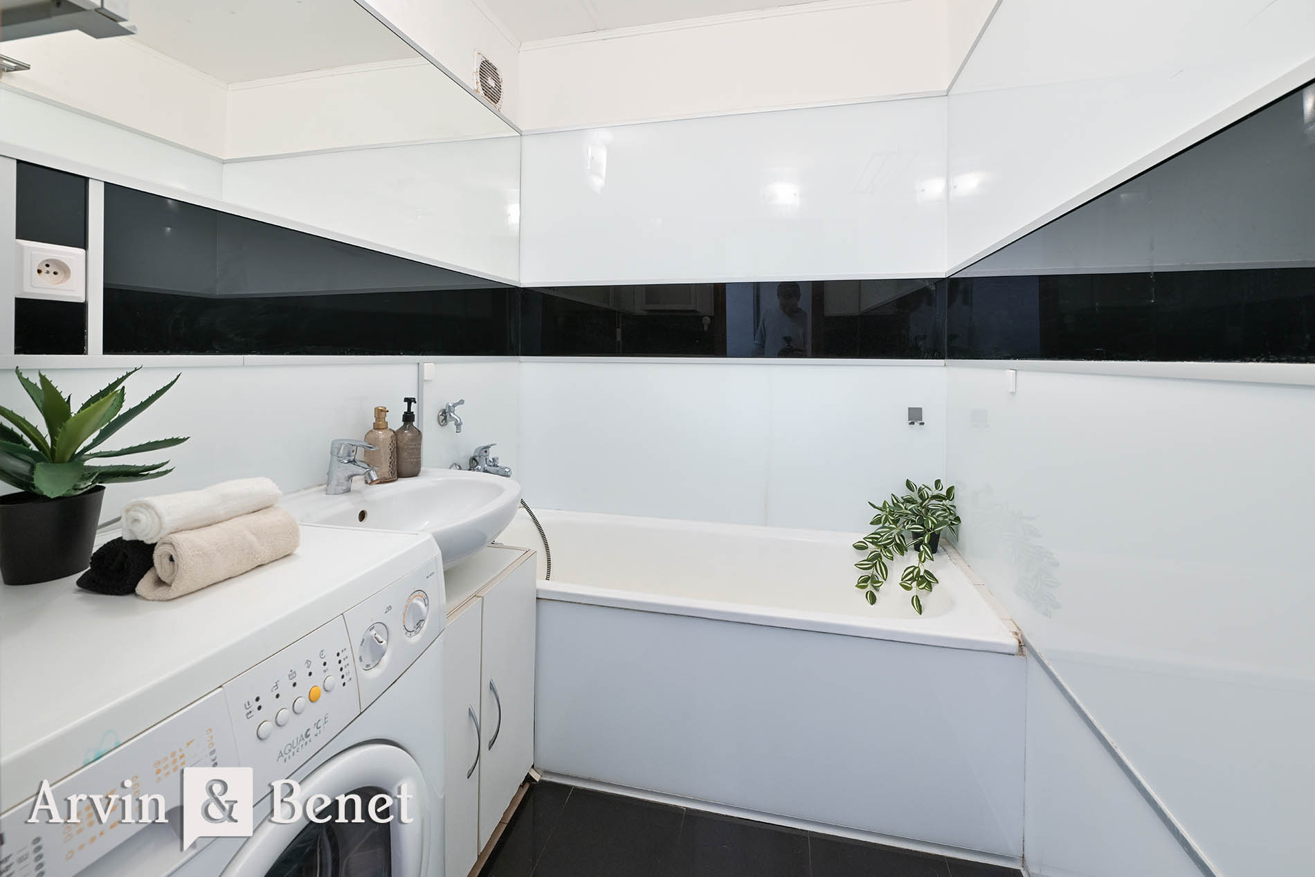kúpeľňa s vaňou a práčkou