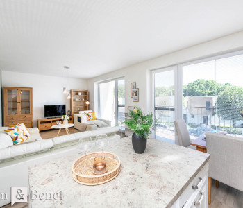 Ďalej chodba plynule nadväzuje na spoločný priestor kuchyne s obývačkou s výstupom na balkón, ktorý sa tiahne po celej dĺžke bytu. Vďaka veľkoformátovým oknám je denná zóna krásne presvetlená. Príjemnú klímu Vám tu zabezpečí úplne nová klimatizácia.