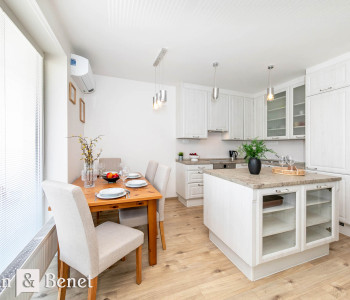 Kuchyňa aj obývačka sú plne zariadené. Kuchyňa je v nadčasovej bielej farbe a disponuje všetkými klasickými spotrebičmi, ktoré bežná domácnosť ku svojmu fungovaniu potrebuje.