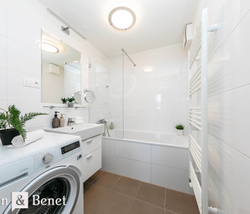 Na predsieň nadväzuje chodba, ktorá prepája celý byt. Po pravej strane sa nachádza samostatné WC a nadčasovo zariadená kúpeľňa s vaňou.