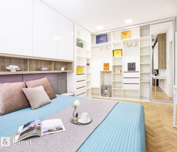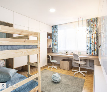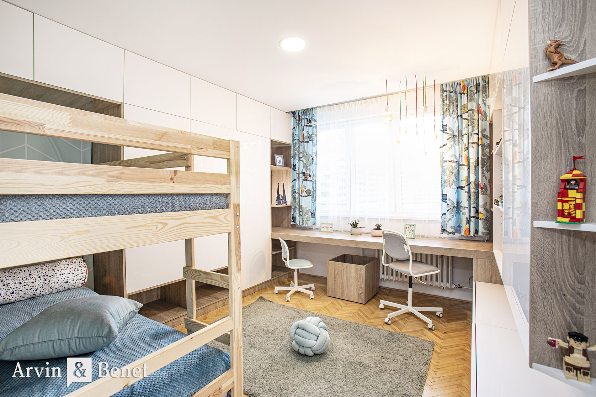 V spálni je šikovne zakomponovaný pracovný kút, čo je ideálnym riešením pre potreby home-office. Na spálňu nadväzuje druhý balkón, stvorený na pokojné večerné posedenie. V spálni nájdete komfortnú posteľ a veľkorysý úložný priestor v podobe štýlového otvoreného šatníka. Detská izba je riešená praktickým vstavaným nábytkom.