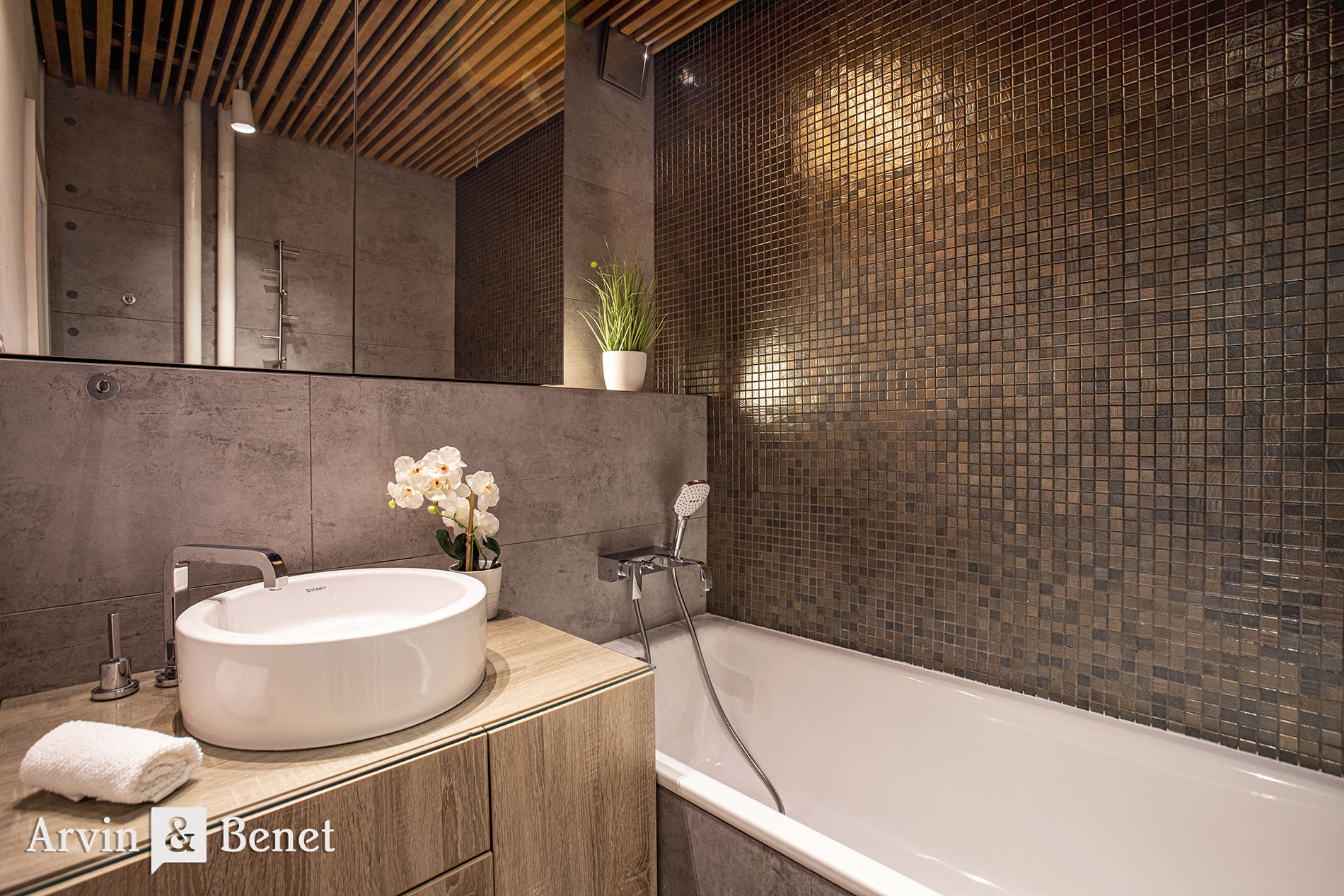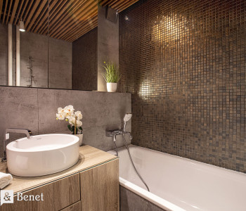 Kúpeľňa je rovnako vybavená prvotriednymi materiálmi, ktoré sú vkusne zladené farebne aj tvarovo. Nachádza sa v nej práčka a rozmerná vaňa, ktorá poskytuje dokonalý relax po náročnom dni.