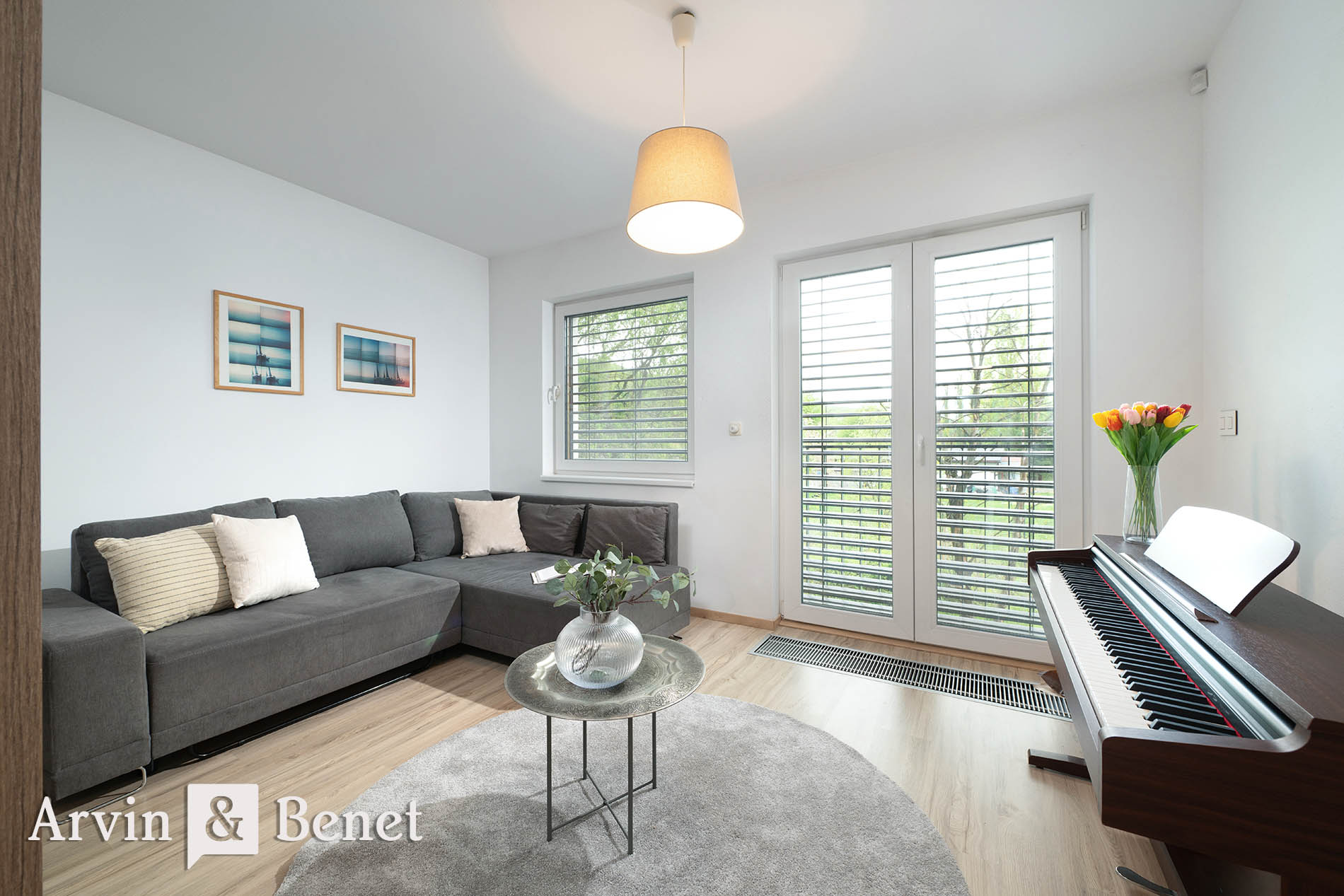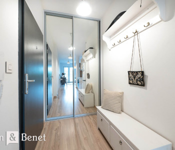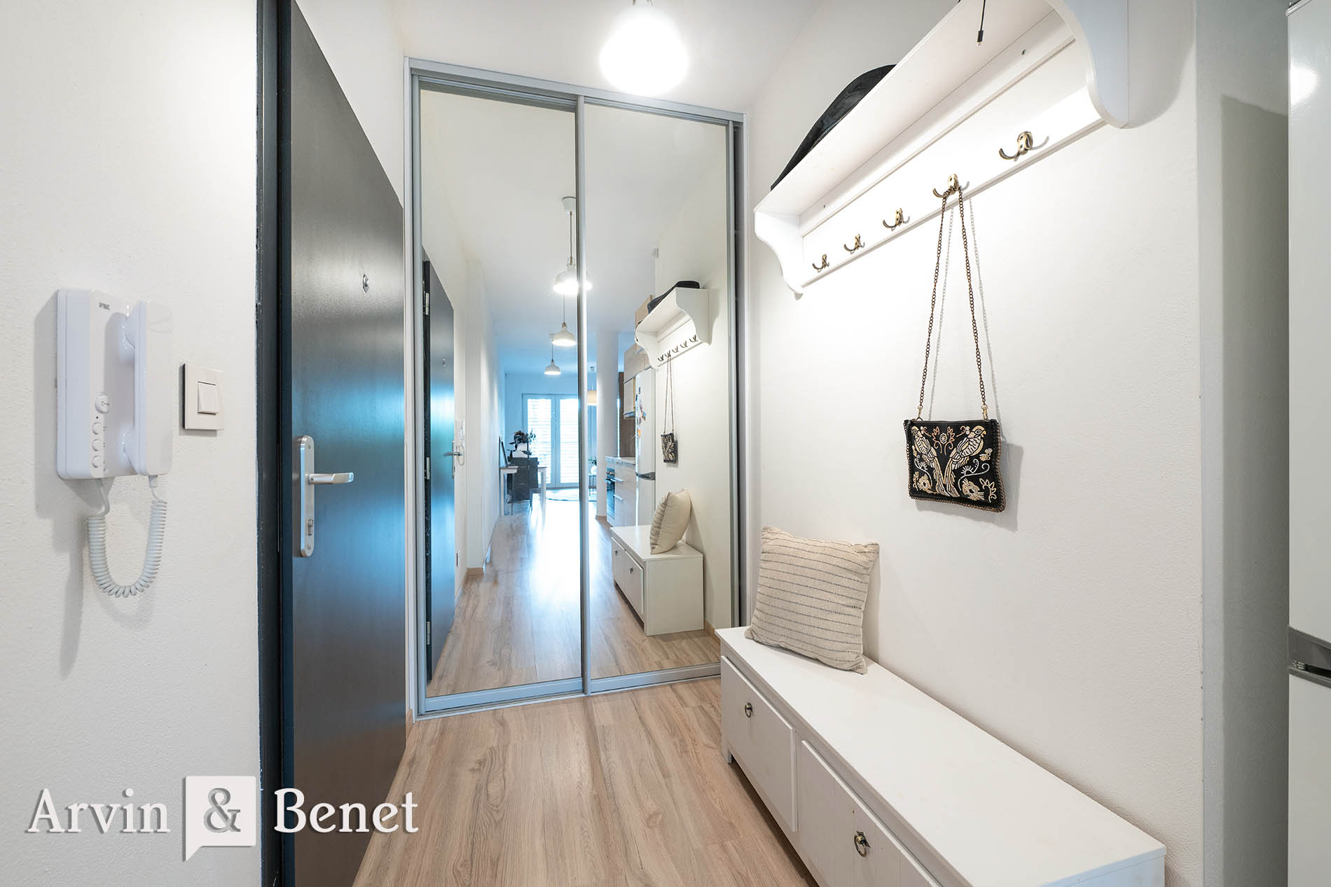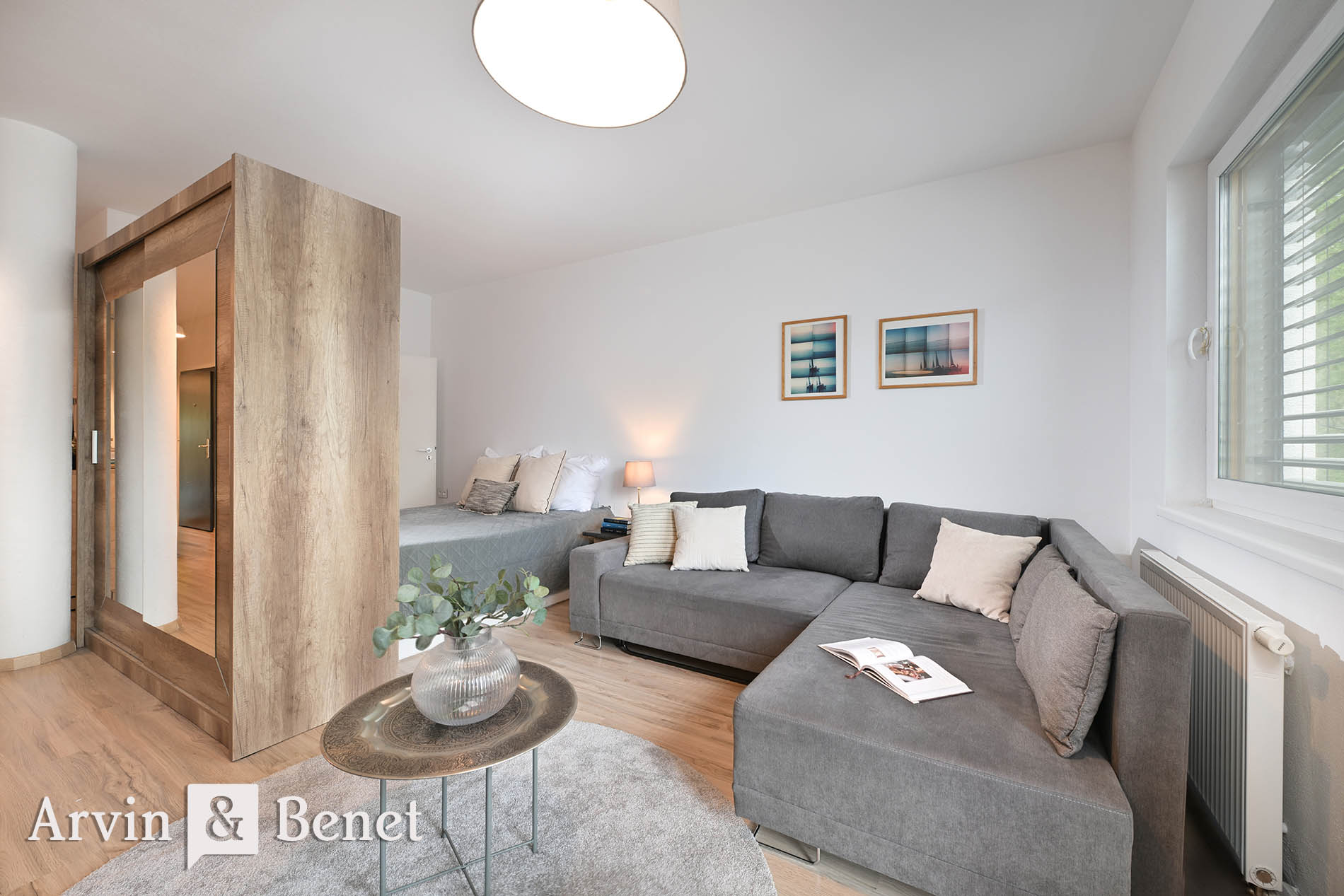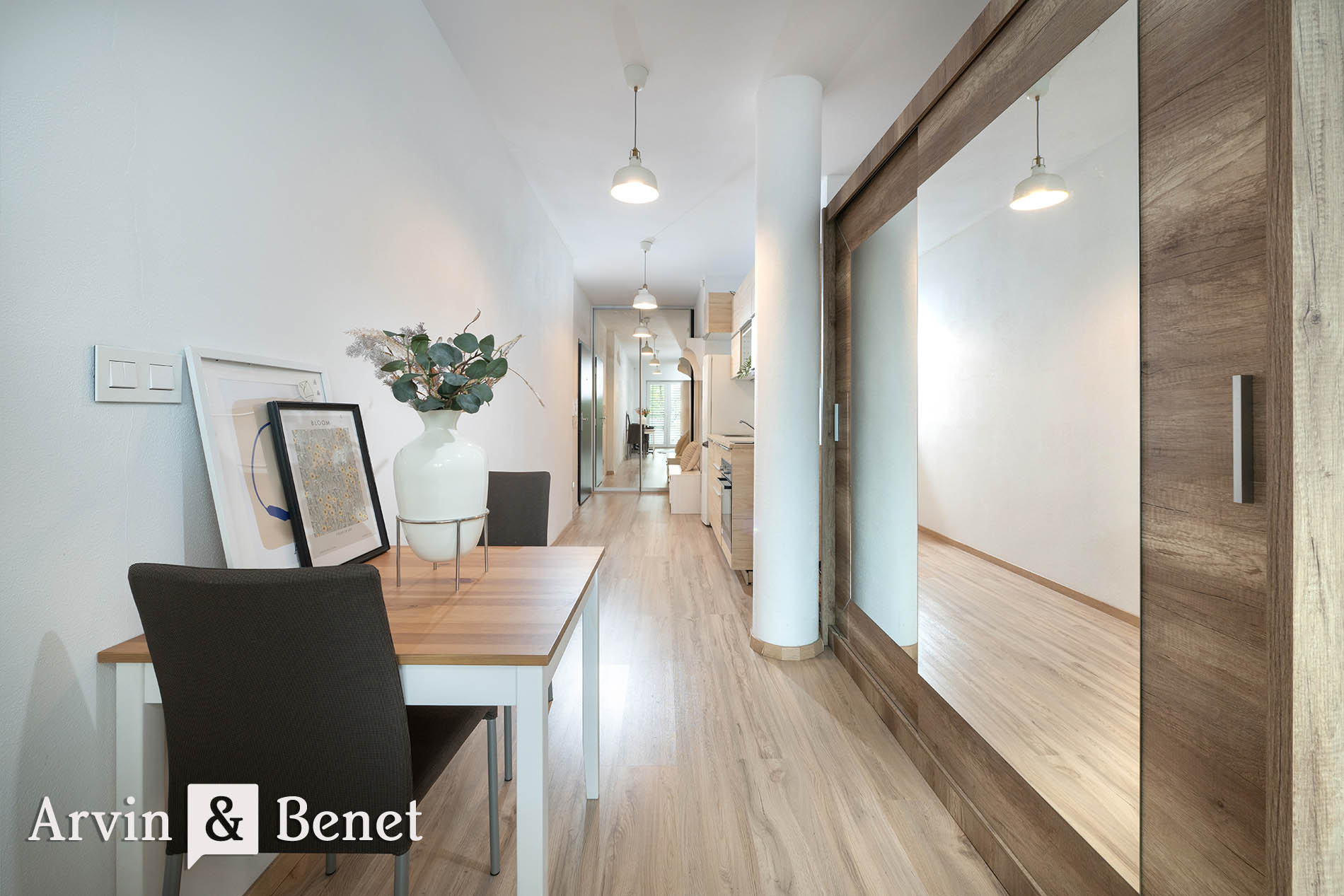 Po vstupe do bytu vás privíta svetlá chodba s dostatkom úložného priestoru, ktorá plynule prechádza do dennej časti. Dispozícia je navrhnutá veľmi nadčasovo a otvorene, čím byt pôsobí oveľa väčším dojmom. Hlavnú časť bytu tvorí priestranná obývacia izba, v ktorej sa nachádza pohodlné rohové sedenie a jedálenský kút. Unikátnym prvkom je optické oddelenie spacej časti pomocou centrálne umiestnenej šatníkovej skrine so zrkadlom. Francúzske balkónové dvere do miestnosti vnášajú prirodzené svetlo a prepájajú interiér s okolitou zeleňou. Kuchyňa je riešená pozdĺžnou linkou v modernom svetlom dekore s kvalitnými spotrebičmi, pričom poskytuje dostatok pracovnej plochy pre každého nadšenca varenia. Kúpeľni dominuje praktický sprchový kút a elegantný obklad v zemitých farbách.