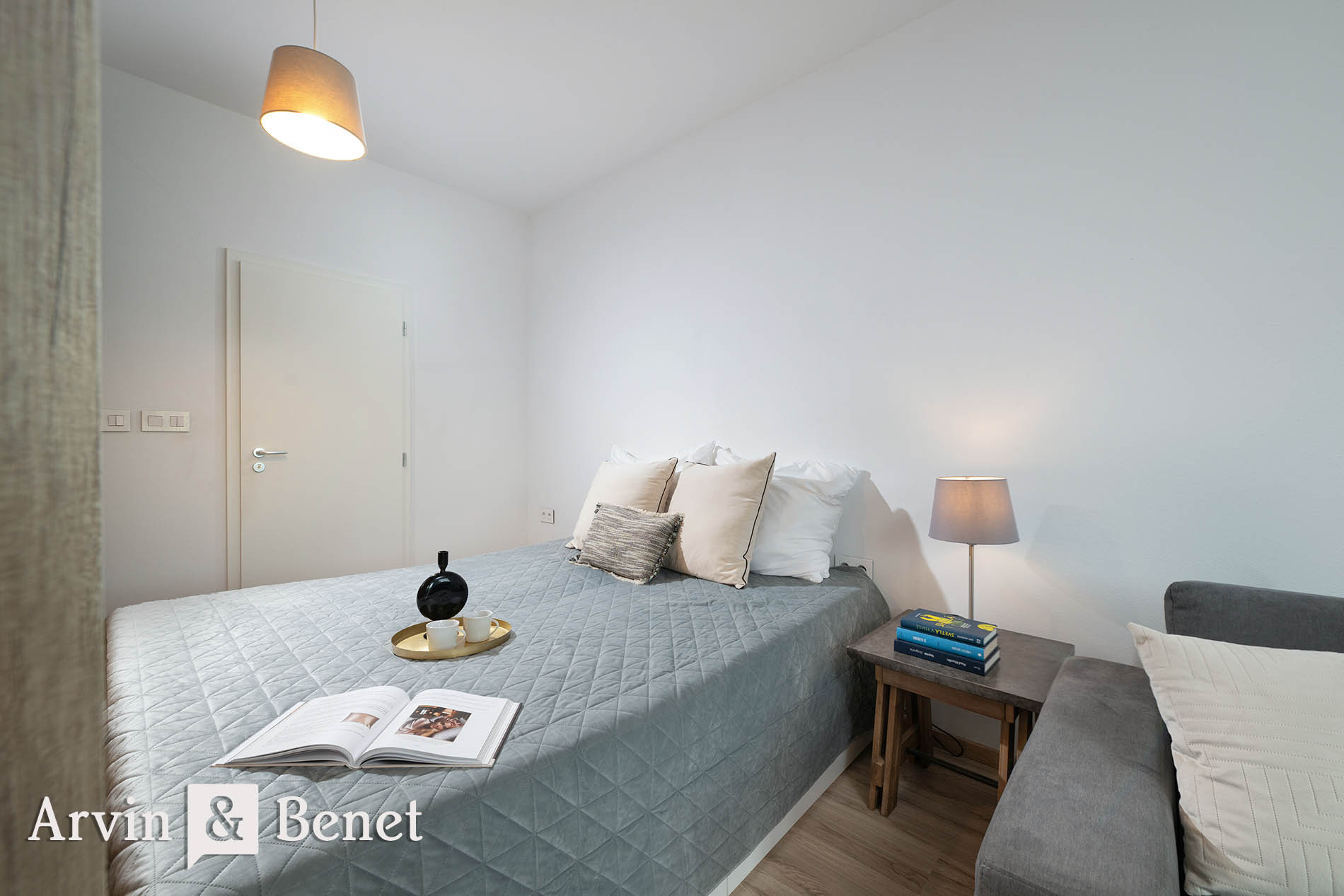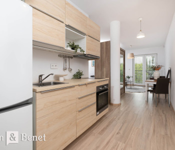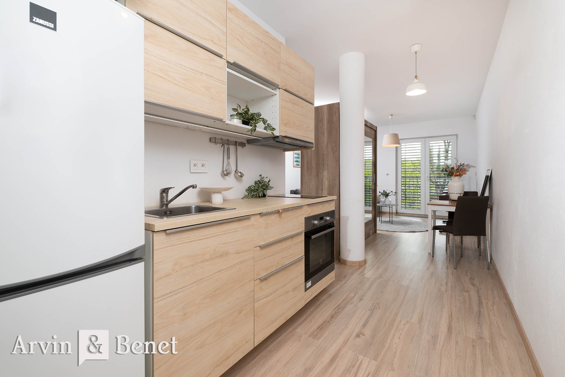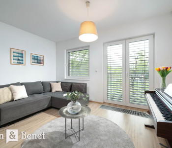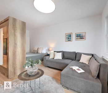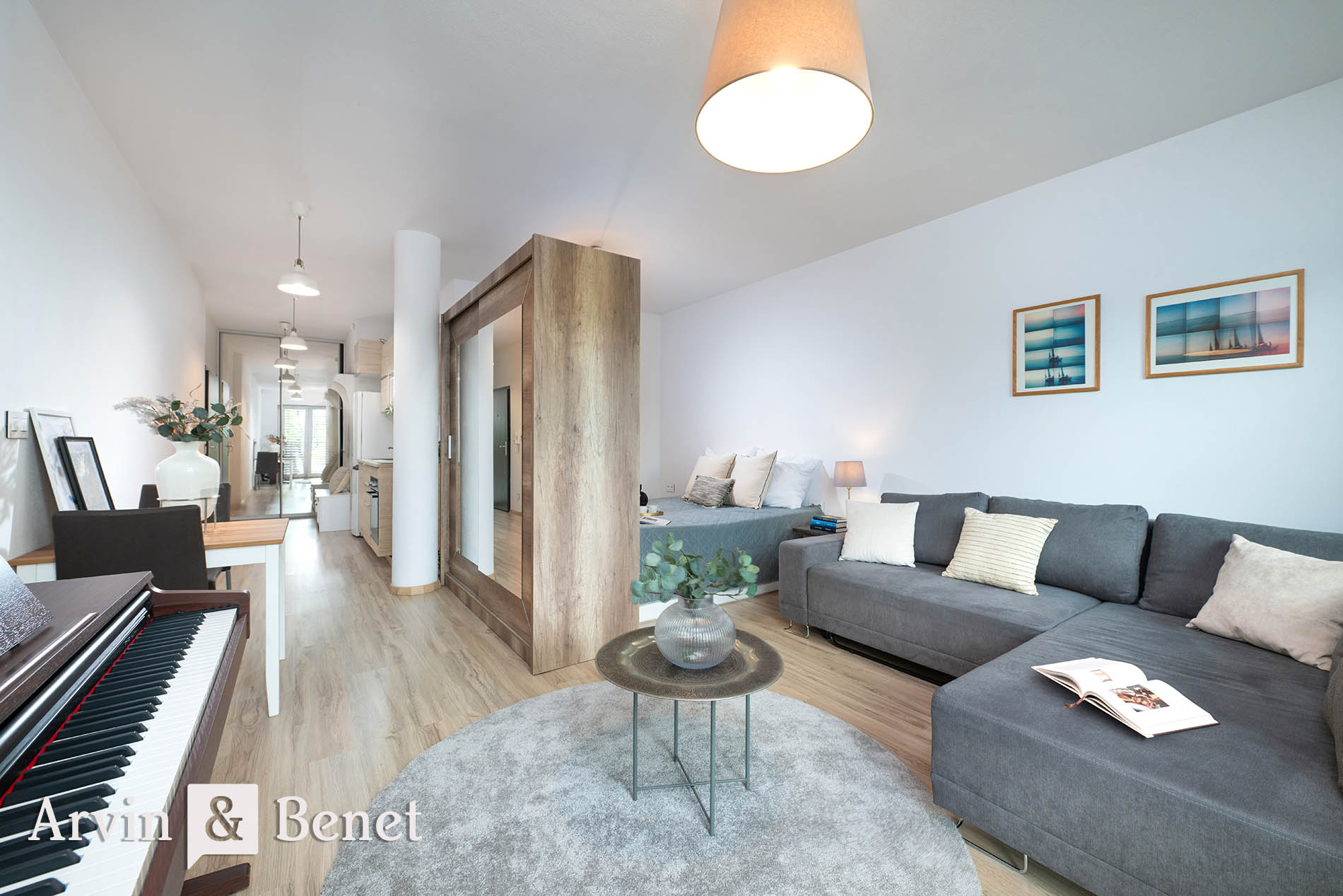 Po vstupe do bytu vás privíta svetlá chodba s dostatkom úložného priestoru, ktorá plynule prechádza do dennej časti. Dispozícia je navrhnutá veľmi nadčasovo a otvorene, čím byt pôsobí oveľa väčším dojmom. Hlavnú časť bytu tvorí priestranná obývacia izba, v ktorej sa nachádza pohodlné rohové sedenie a jedálenský kút. Unikátnym prvkom je optické oddelenie spacej časti pomocou centrálne umiestnenej šatníkovej skrine so zrkadlom. Francúzske balkónové dvere do miestnosti vnášajú prirodzené svetlo a prepájajú interiér s okolitou zeleňou. Kuchyňa je riešená pozdĺžnou linkou v modernom svetlom dekore s kvalitnými spotrebičmi, pričom poskytuje dostatok pracovnej plochy pre každého nadšenca varenia. Kúpeľni dominuje praktický sprchový kút a elegantný obklad v zemitých farbách.