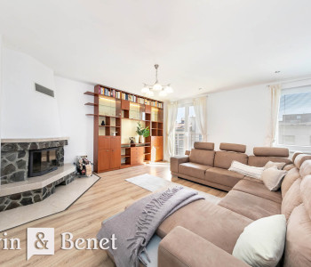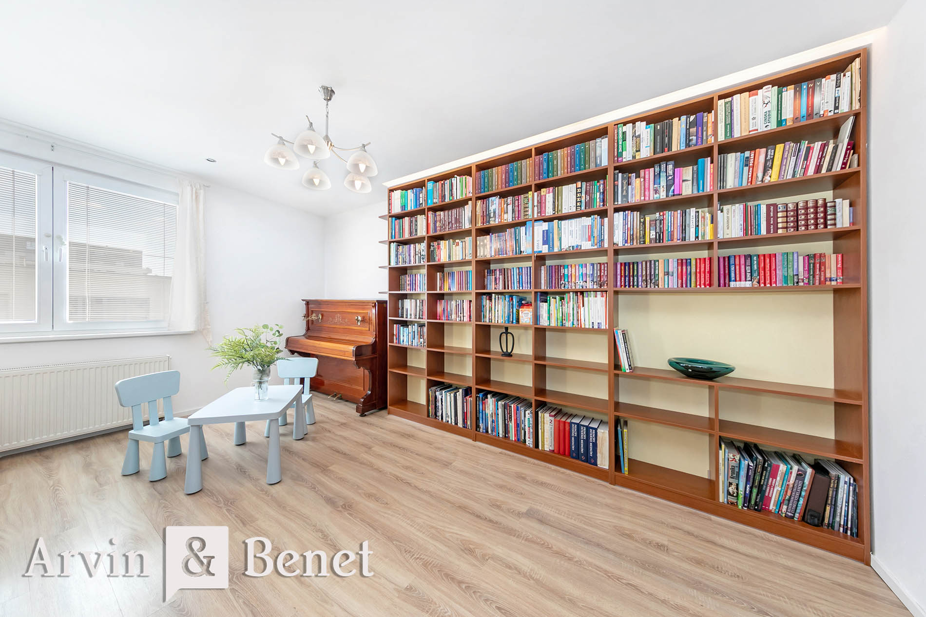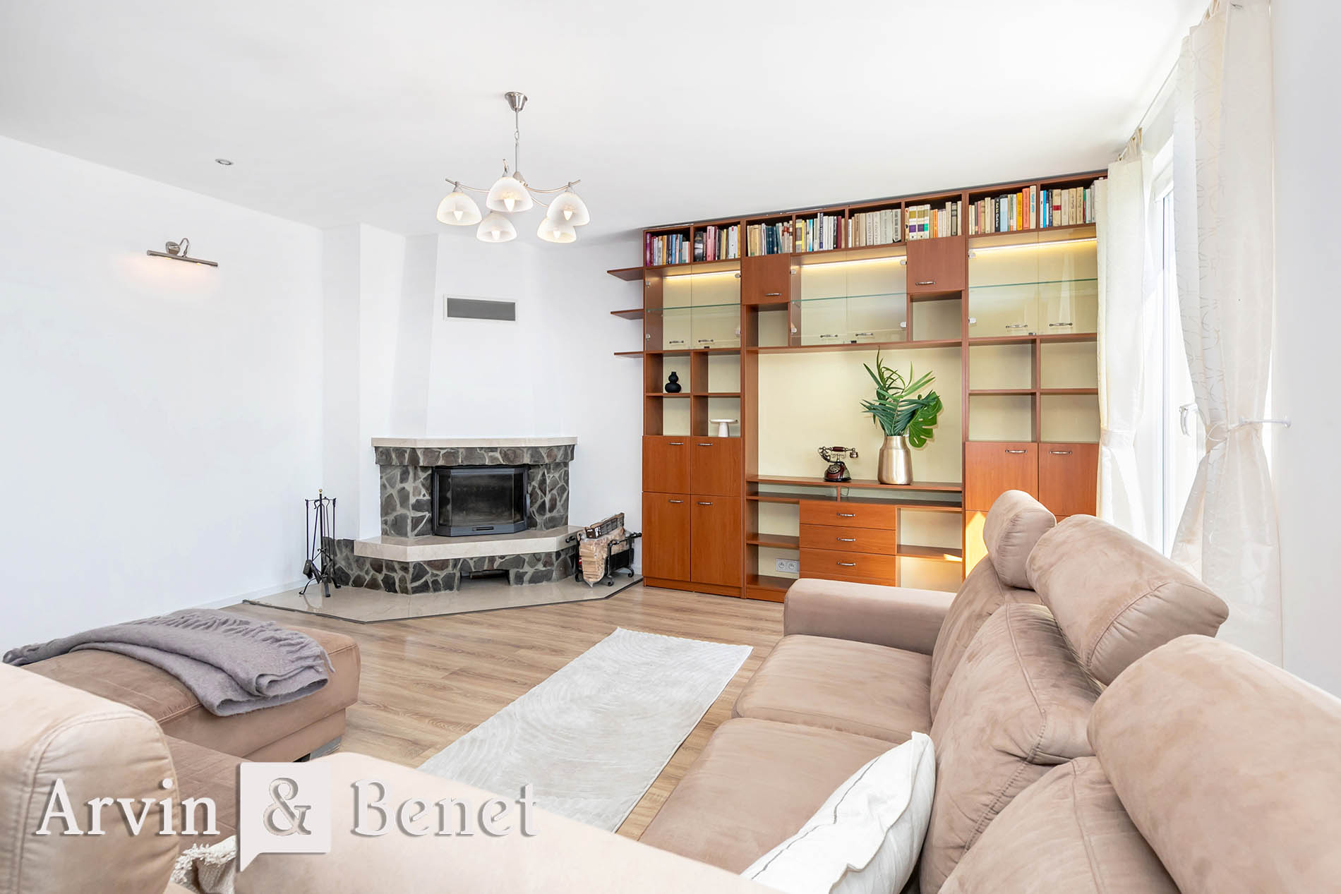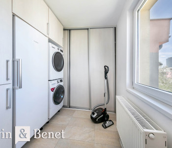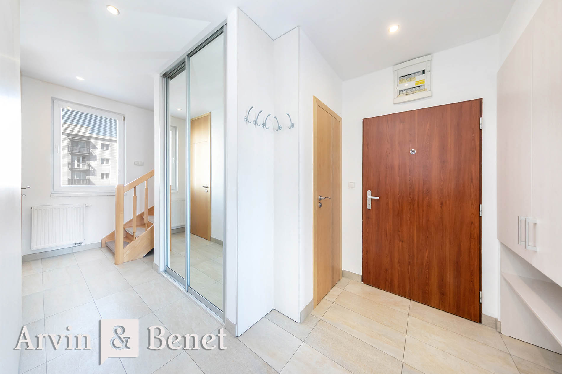 Byt sa rozkladá na dvoch vnútorných podlažiach a každé z nich má svoju atmosféru. Vstupné podlažie patrí spoločnému životu. Obývacia izba s funkčným krbom napojeným na komín, kuchyňa a kúpeľňa. Schodiskom sa dostanete do súkromnej zóny, kde je rozľahlá spálňa s kúpeľňou a s vaňou, pracovný kútik a priestranný šatník s práčovňou. Tento priestor vznikol spojením dvoch pôvodných izieb a pri záujme nového majiteľa ho možno jednoducho vrátiť do plnohodnotnej 4-izbovej dispozície. Celý interiér vrátane vstavených skríň a všetkých spotrebičov je súčasťou predaja. Nasťahujete sa a nič neriešite.
