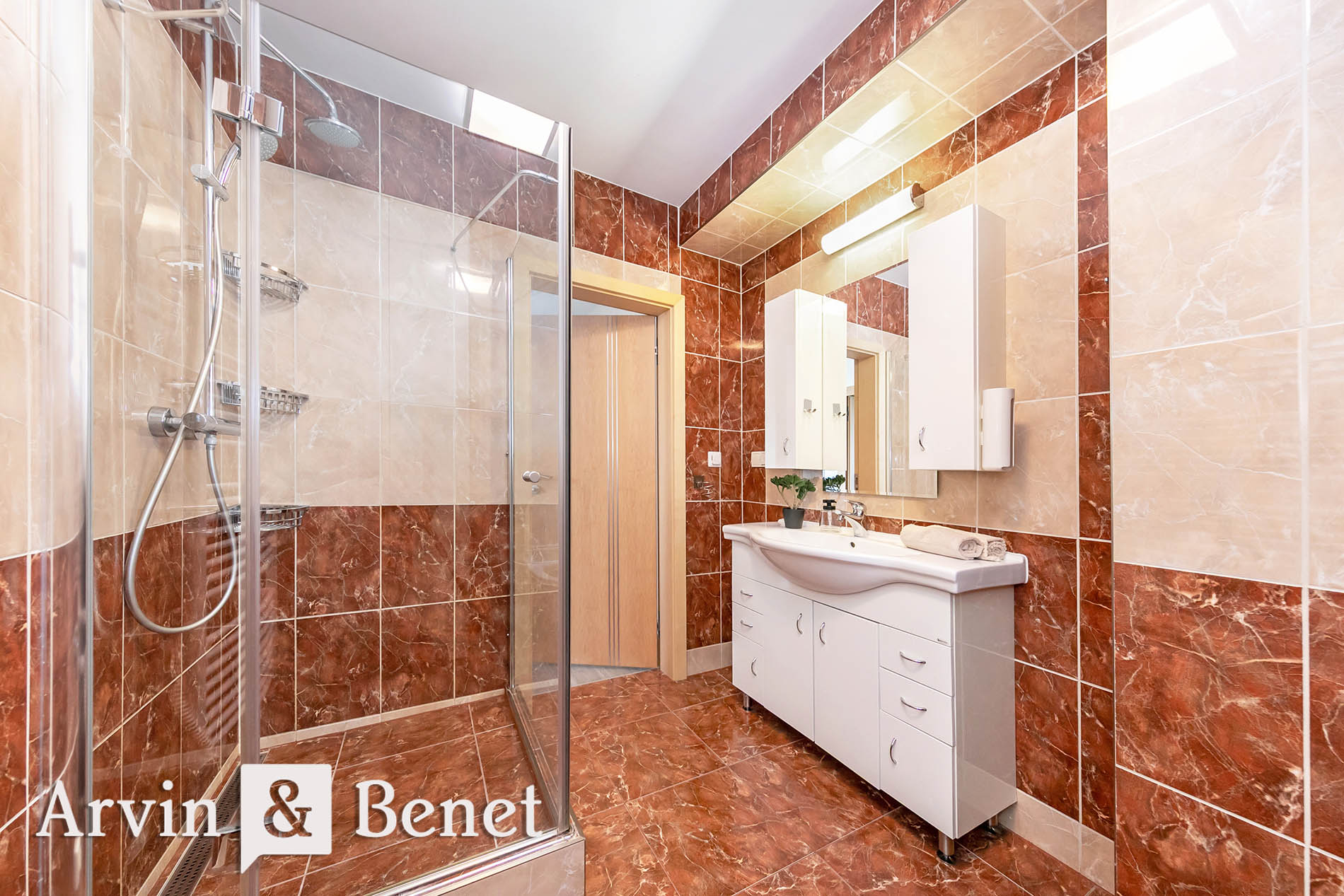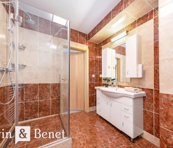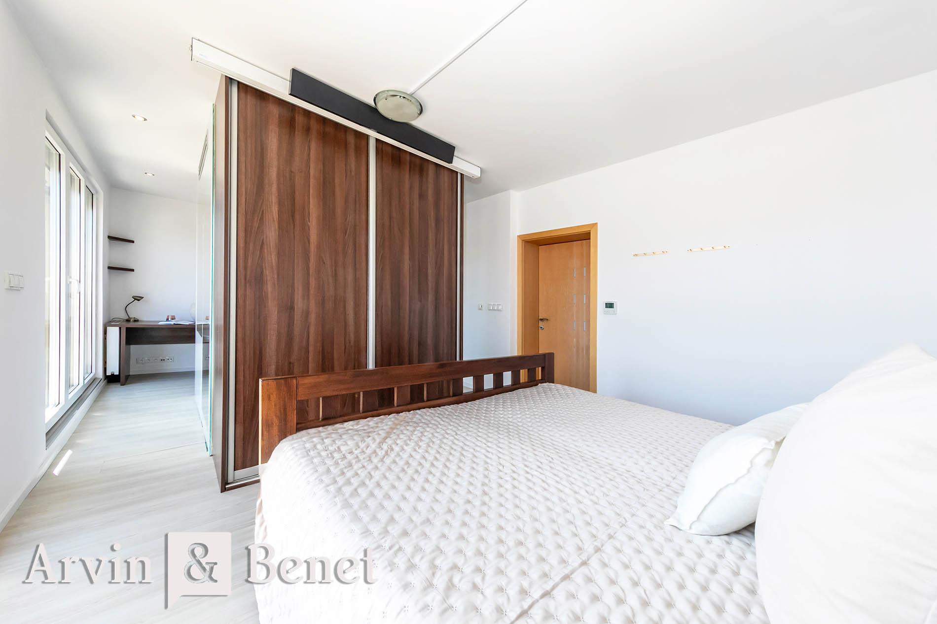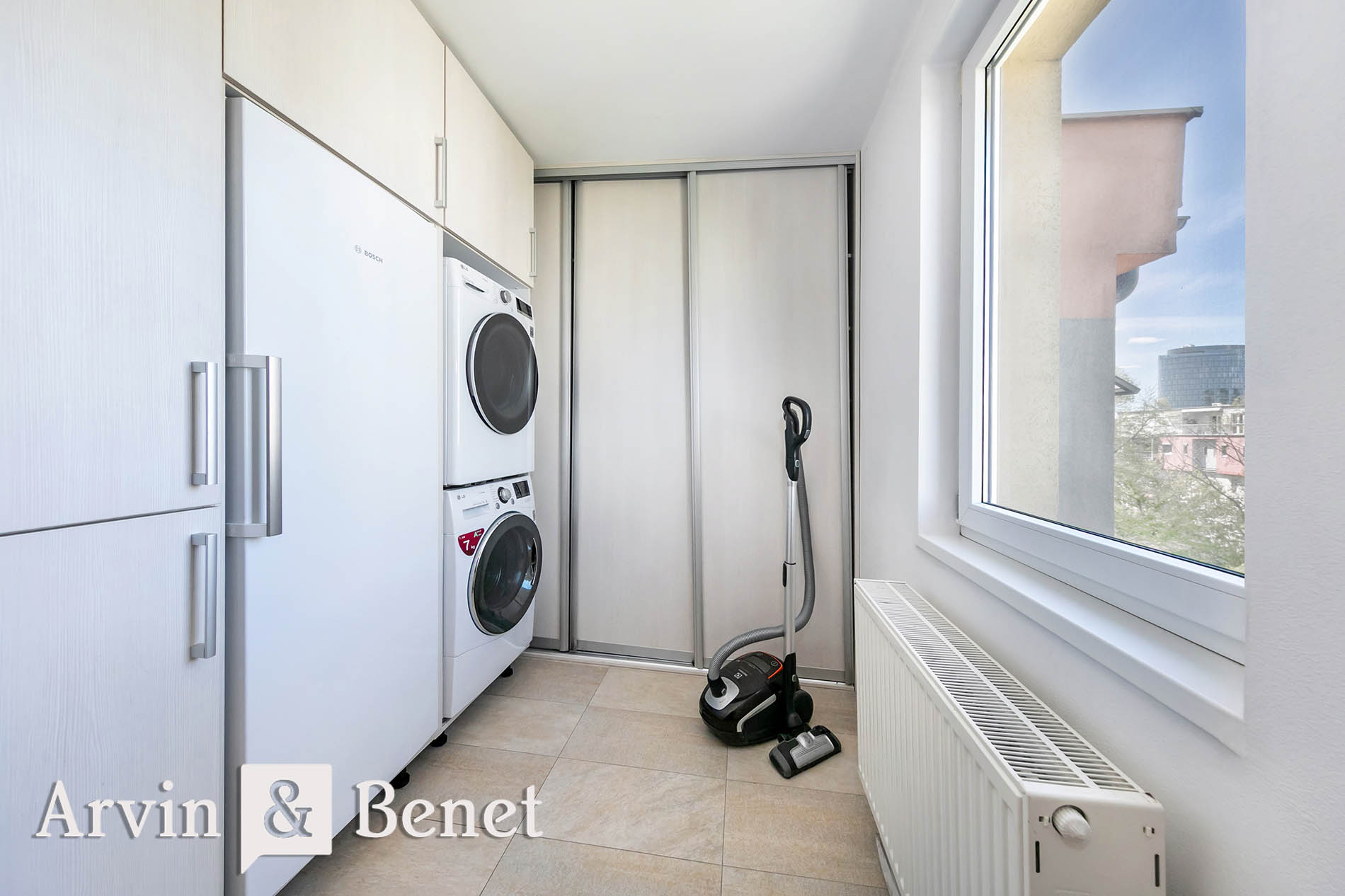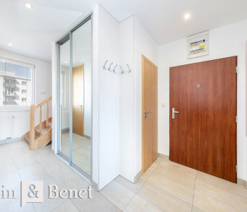 Byt sa rozkladá na dvoch vnútorných podlažiach a každé z nich má svoju atmosféru. Vstupné podlažie patrí spoločnému životu. Obývacia izba s funkčným krbom napojeným na komín, kuchyňa a kúpeľňa. Schodiskom sa dostanete do súkromnej zóny, kde je rozľahlá spálňa s kúpeľňou a s vaňou, pracovný kútik a priestranný šatník s práčovňou. Tento priestor vznikol spojením dvoch pôvodných izieb a pri záujme nového majiteľa ho možno jednoducho vrátiť do plnohodnotnej 4-izbovej dispozície. Celý interiér vrátane vstavených skríň a všetkých spotrebičov je súčasťou predaja. Nasťahujete sa a nič neriešite.